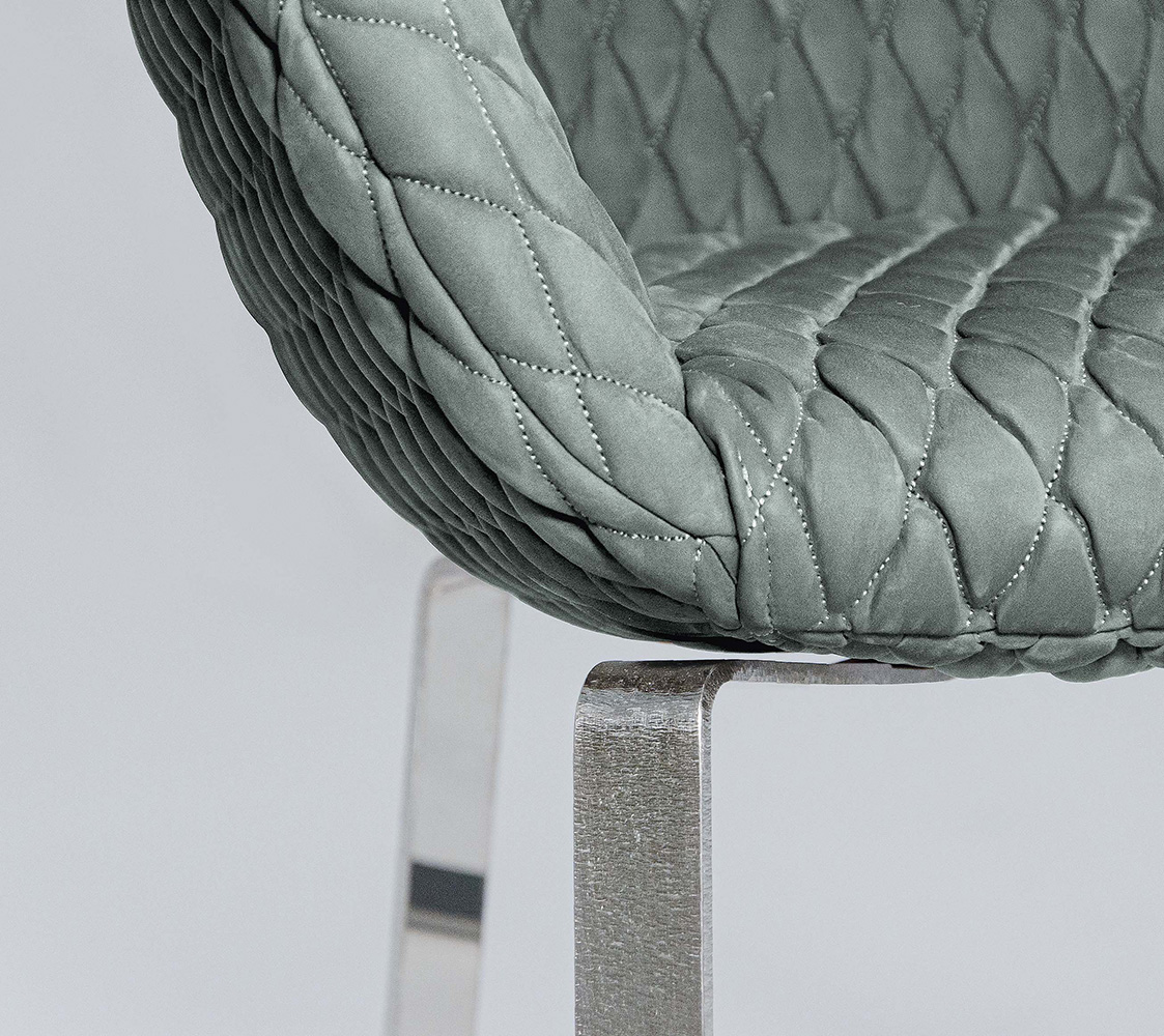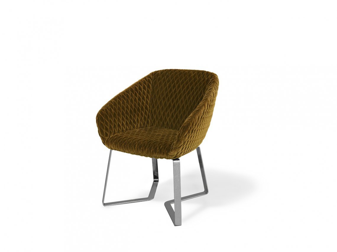 The armchair Oliver is a piece that recalls the style of the 50s. The whole seat is wrapped in a diamond-shaped quilting that gives the surface a three-dimensional light-and-dark effect. The structure supporting the seat is made up of two metal ribbons which, embellished by hand-made sculptural work, create a pleasant geometric effect. This armchair is customizable with upholstery in leather or fabric as well as in the chromatic metal finishes.