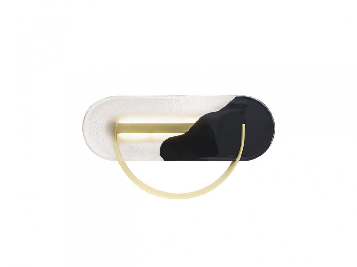 A bent metal blade with half-moon shape supports the artistic glass elements of the wall lamp DEMILUNE. The glass elements are made with an ancient process of double casting in plate of black and transparent glass, also known as “submerged glass”. This process allows to create unique elements always different one from each other. The brushed gold metal detail makes this wall lamp a contemporary artwork.