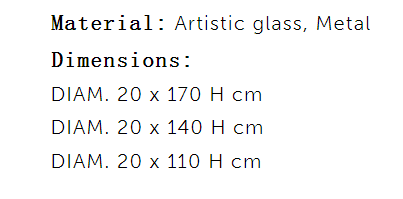 The chandelier Lapis is composed by three metal cylinders from which tapered artistic glass elements hang. The cylinders of the structure have different heights and are in brushed bronze finish. The artistic glass elements are hand-blown by the Masters glassmakers of Venice area and their surface, once the glass is still liquid, is covered with glass grain. When crossed by the light, the glass spreads reflections into the environment thus creating an exclusive atmosphere.