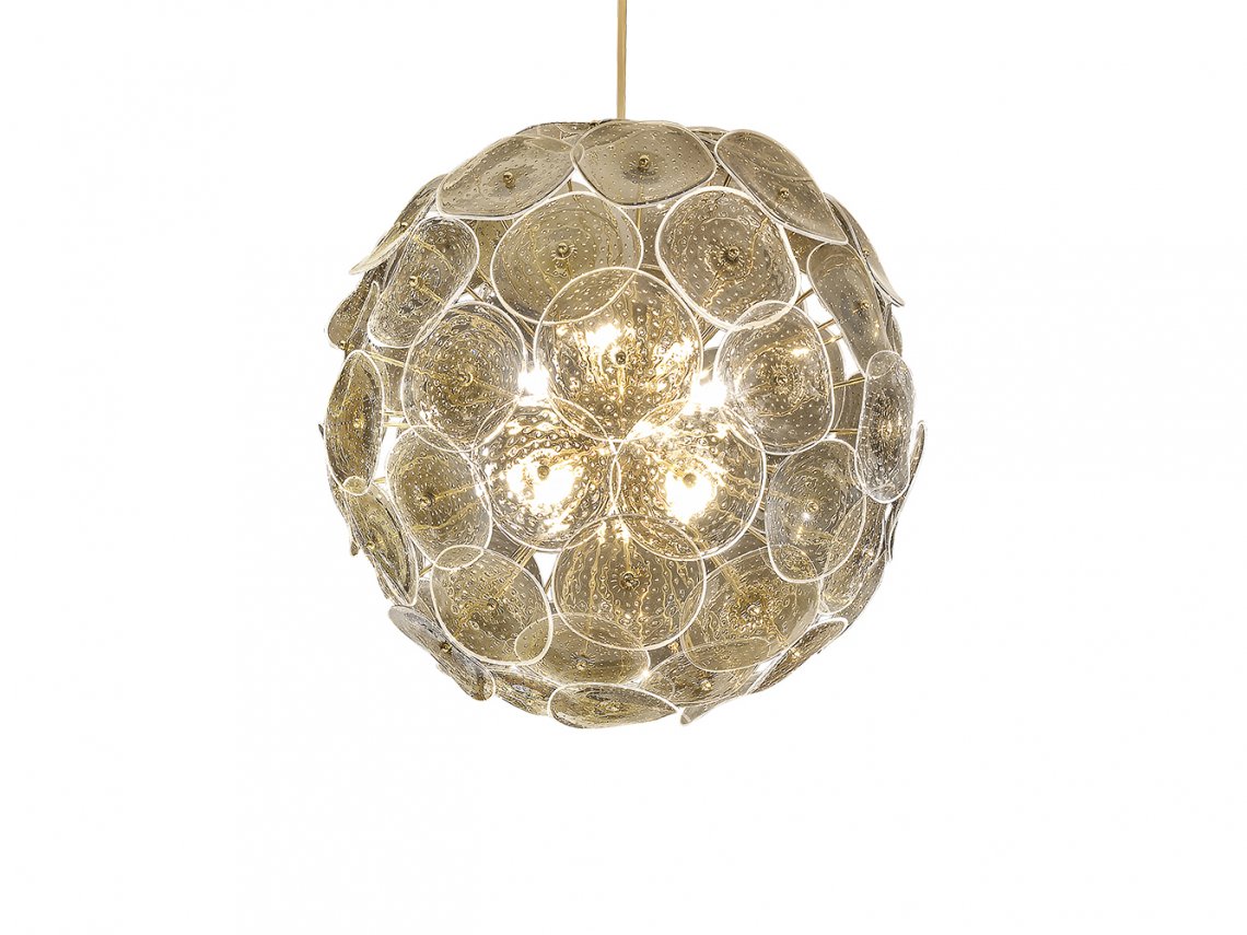 Richmond chandelier has been designed to astonish the customers: from a central metal sphere come out thin metal bars that support handmade glass petals realized by master glassmakers from Venice area. A traditional glass technique creates bubbles inside the petals which are able to spread beautiful light reflections. The glass is available in gold or in blue colour.