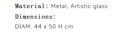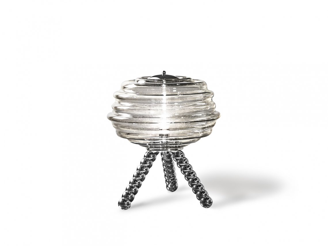 Table lamp Cooper is composed by three metal legs that merge at the base of a glass blown element realized by master glassmakers in Venice area. The light comes out through the glass exalting its preciousness in terms of colour and shape while the metal part is realized as if they were a chain made up of little spheres.