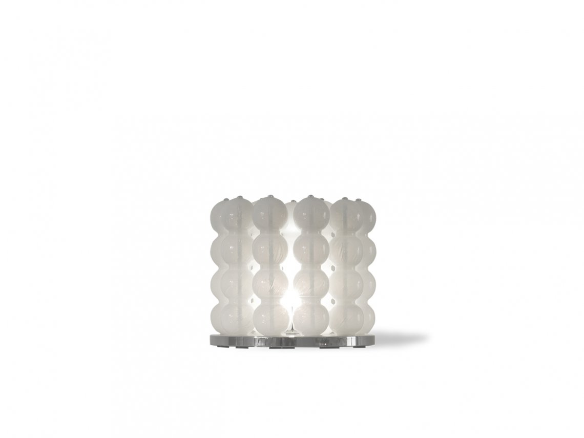 The table lamp Opalino is composed by blown glass elements as result of artistic skills of master glass makers. These spheres are connected one to the other and once enlightened, a play of lights is radiated in the room.