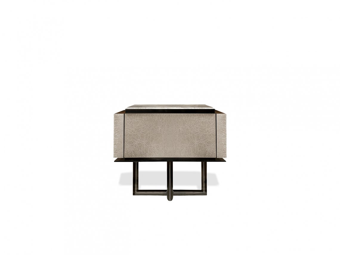 With a contemporary design night table Grant is the perfect choice for a spacious bedroom. A complex lacquering process with ”Crackle” effect which gives it a decorative appearance, hardly found in other contemporary furniture. Available in two different dimensions with a single drawer, it has a metal base with a tubular cross motif that gives further elegance and refinement to this piece of furniture.