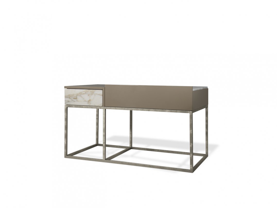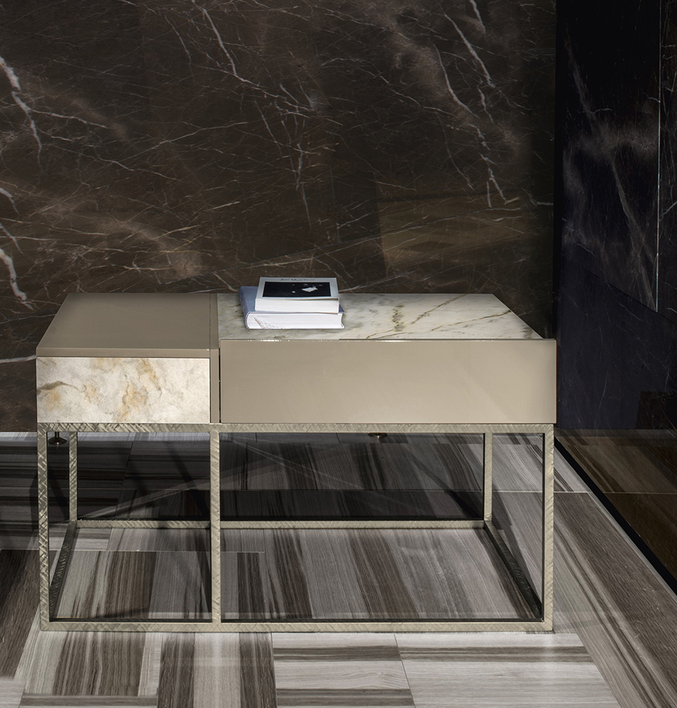 A continuous sequence of right angles defines the shape of Lineup night table. The design and proportions are the result of research inspired by the art movement ”De Stijl”, also known as neoplasticism, which is expressed by basic and geometric lines. The skillful manual method of engraving on the metal base is inspired by the working techniques of Italian premium class jewelry. In the drawers and on the top,marbles and pastel colours finished are combined in perfect harmony.