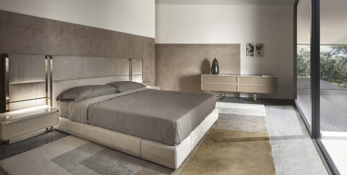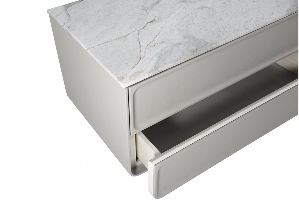 The drawer unit Nova with drawers and rounded shape can be considered the protagonist of the bedroom. The care to details is visible on the drawers decorated with three-dimensional frames upholstered with soft leather. The structure is supported by two metal bases that characterize the collection while the internal sides are made up of eucalyptus wood.