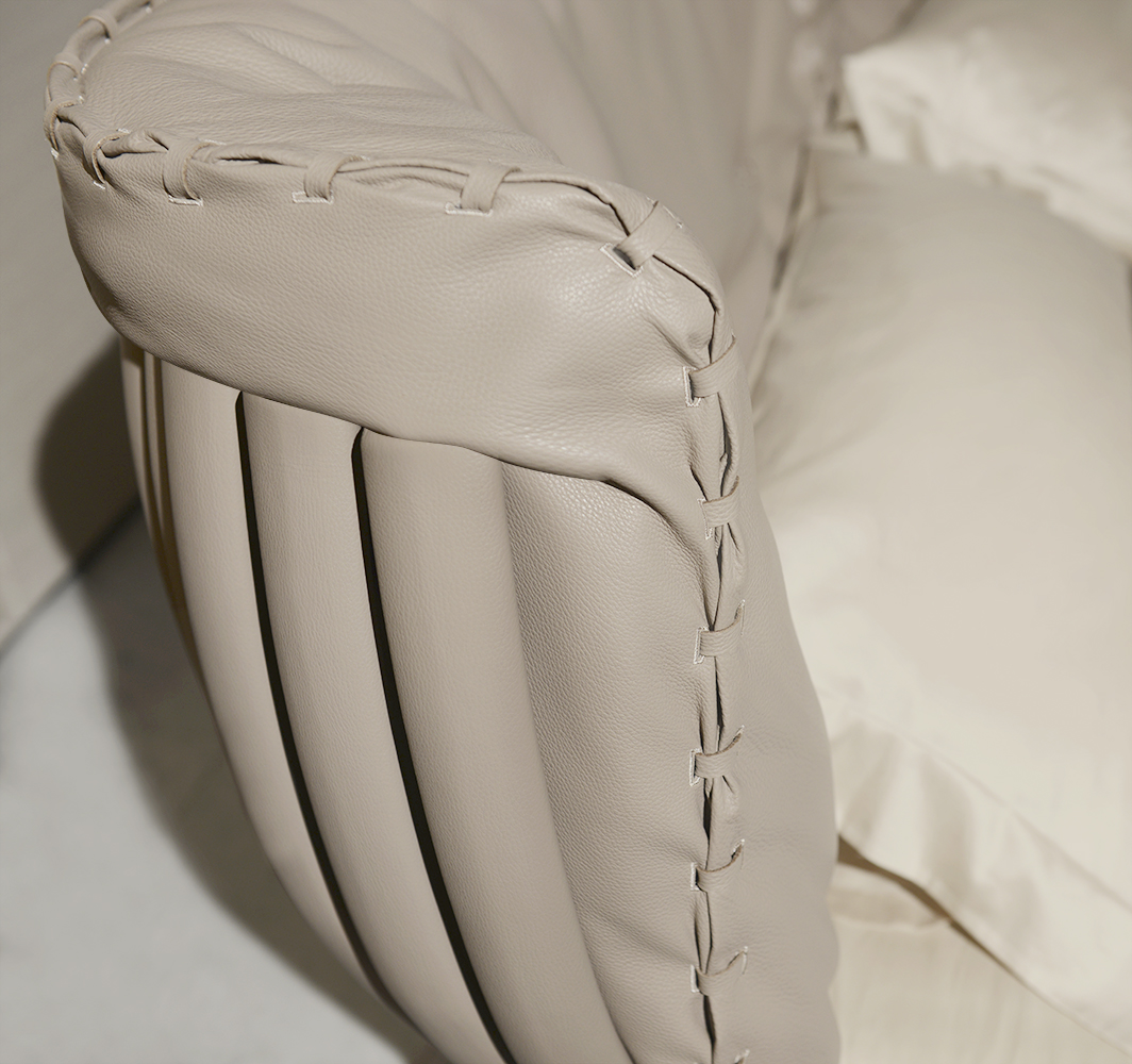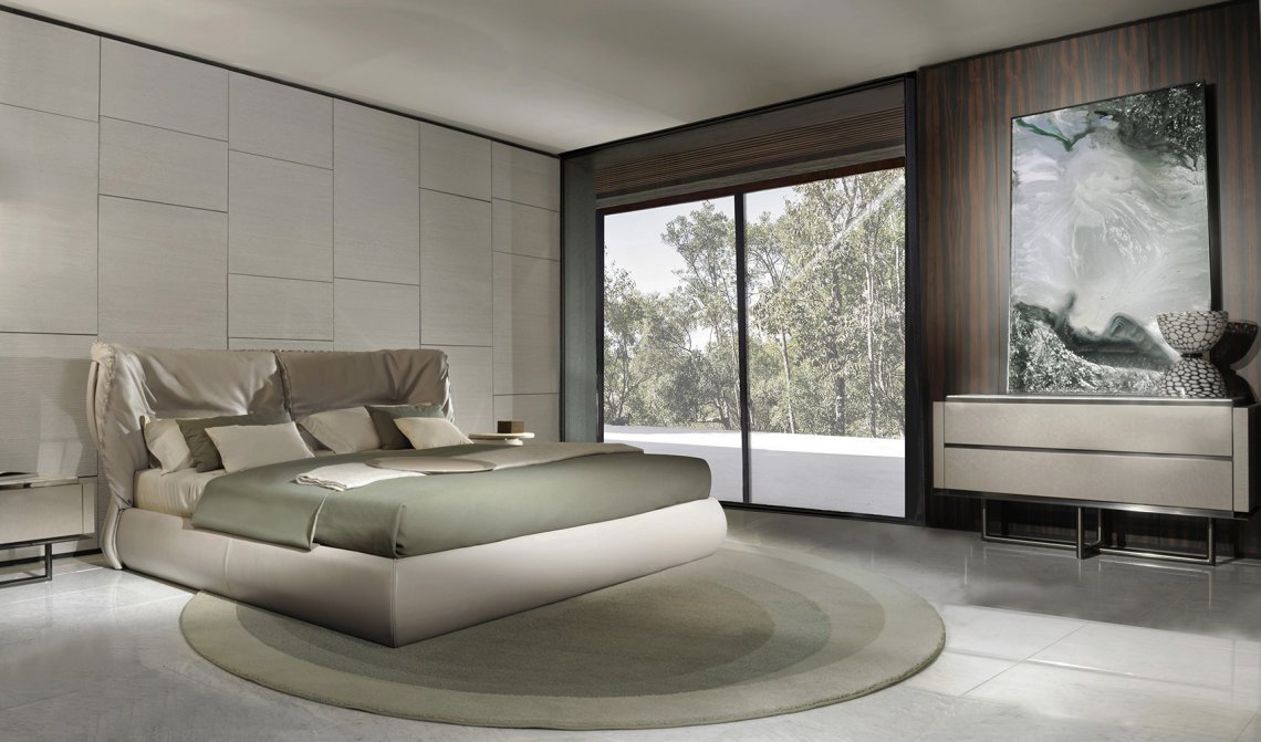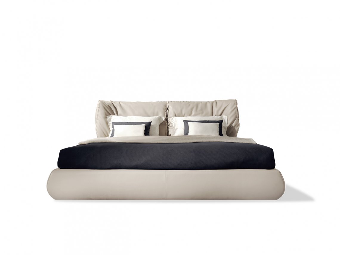 Cannes bed has at the end of the headboard a series of curved plywood elements with an oval section covered in leather or fabric by skilled craftmen. Two soft cushions with exclusive tailored seams rest on the curved elements of the back. It can be easily inserted in contemporary villas but also in apartments located in ancient buildings.