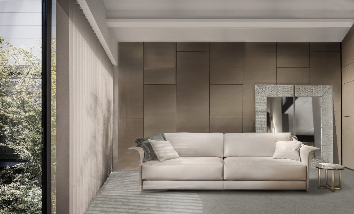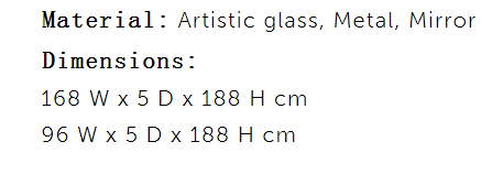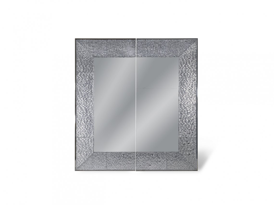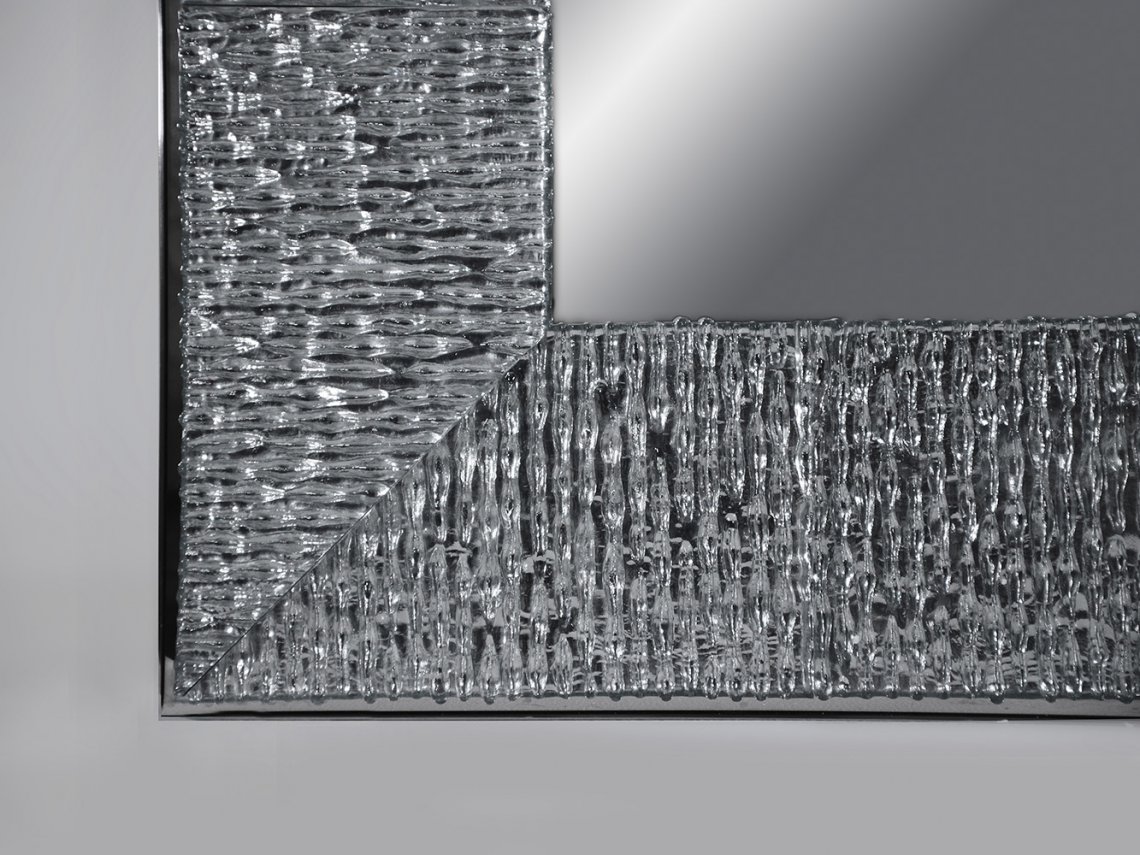 Abby is a decorative mirror divided into two symmetrical parts placed side by side. Resting on the ground against a wall, it gives a great atmosphere to a living area, but it can play a decorative and functional role near an entrance. The frame, impressive for its size, is made of precious glass cast in plate by master glassmakers in the area of Venice. All the mirror frame is marked by flexuous movements like the sea ripples. It is made even in rectangular shape with a smaller size.