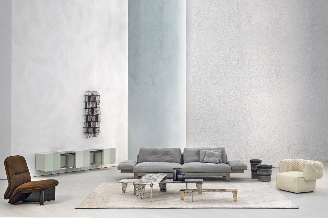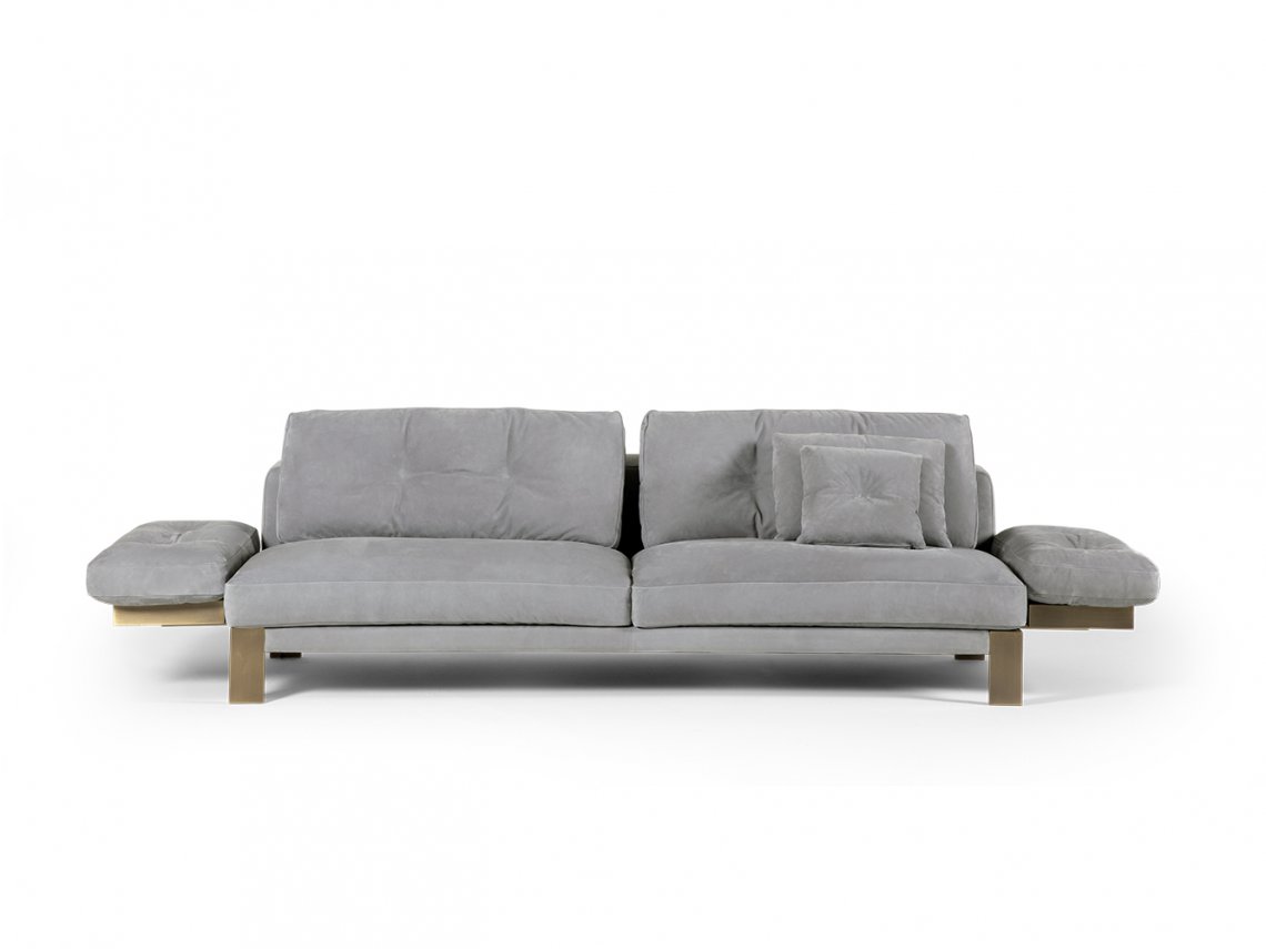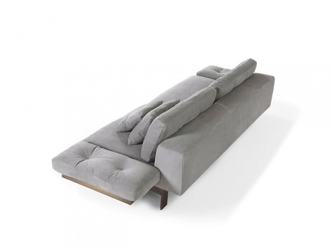The sofa Levante has a design characterized by soft lines and floating parts that are supported by metal elements. Its maximum expression is reached through the leather upholstery but it can be also upholstered with three-dimensional fabrics. The metal parts are also available with brushed dark bronze finish.