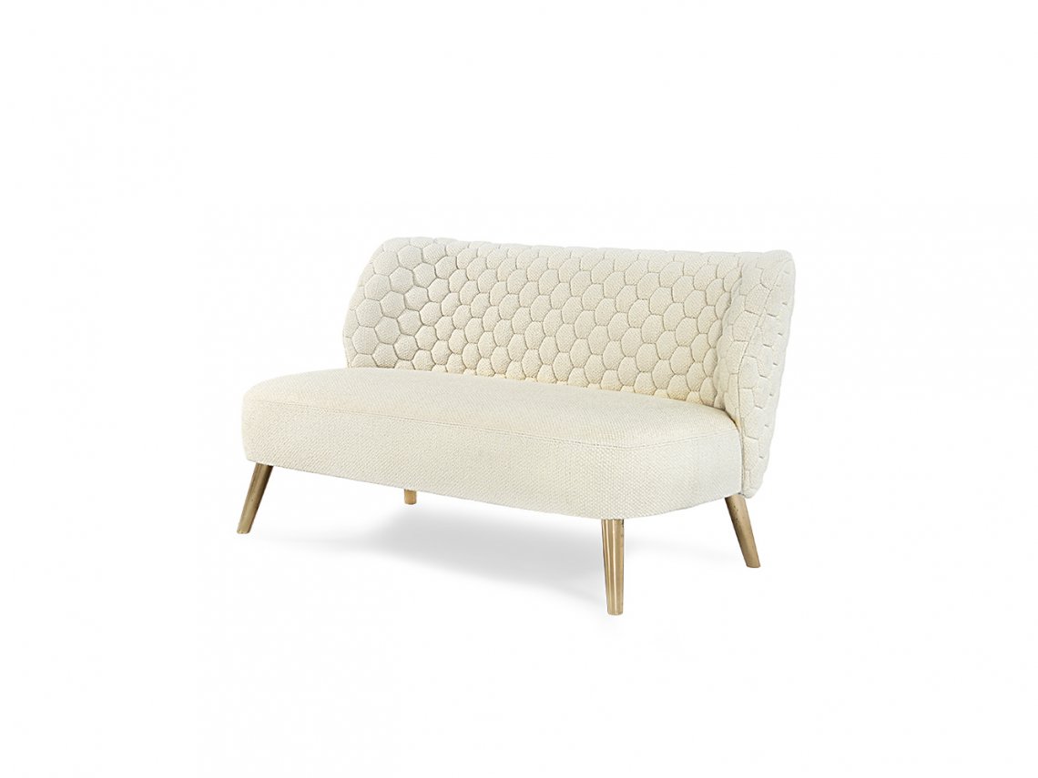 The enveloping and comfortable sofa Marilou can be upholstered only with selected textured fabrics. The backside is characterized by a quilting embroidered with hexagonal design. The bronze metal feet are realized with the ancient sand casting technique that conveys an artistic touch to the sofa.