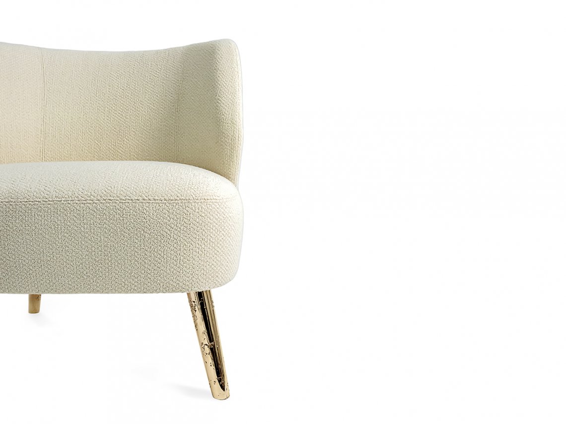 The enveloping and comfortable armchair Marilou can be upholstered only with selected textured fabrics. The backside is characterized by a quilting embroidered with hexagonal design. The bronze metal legs are realized with the ancient sand casting technique that conveys an artistic touch to the armchair.