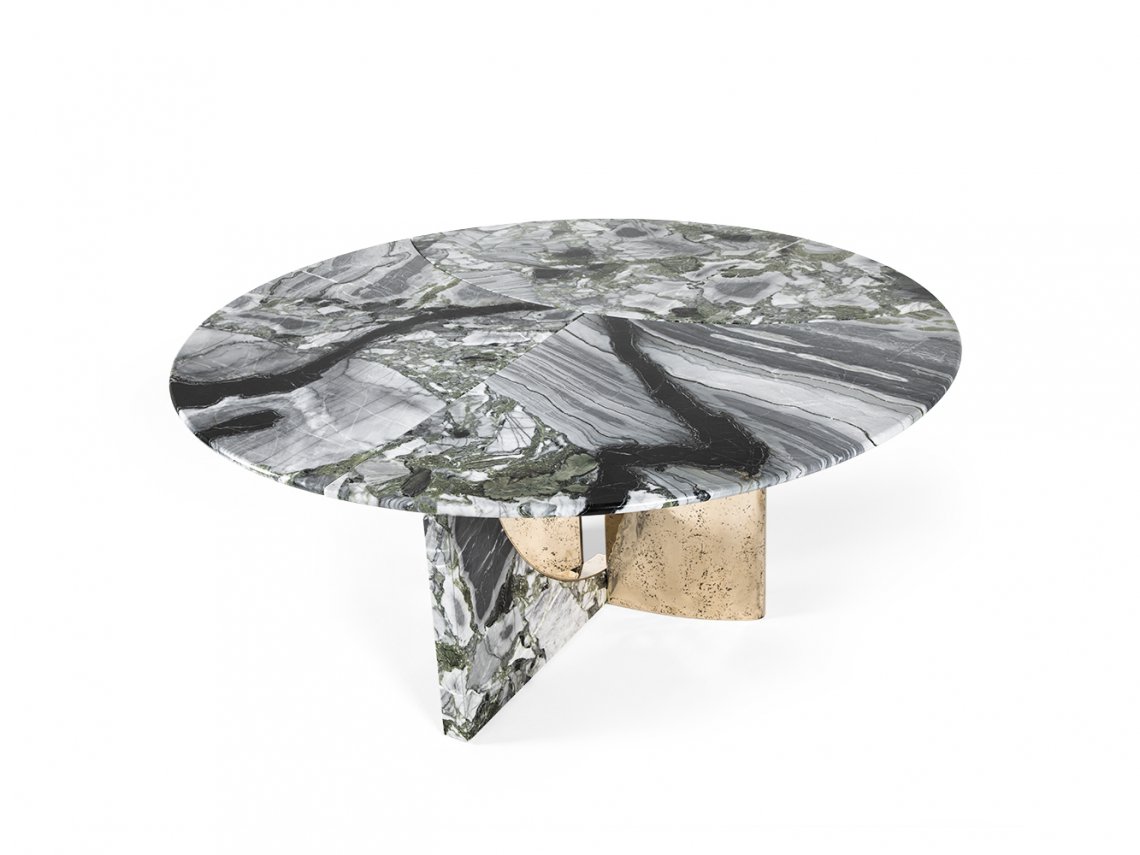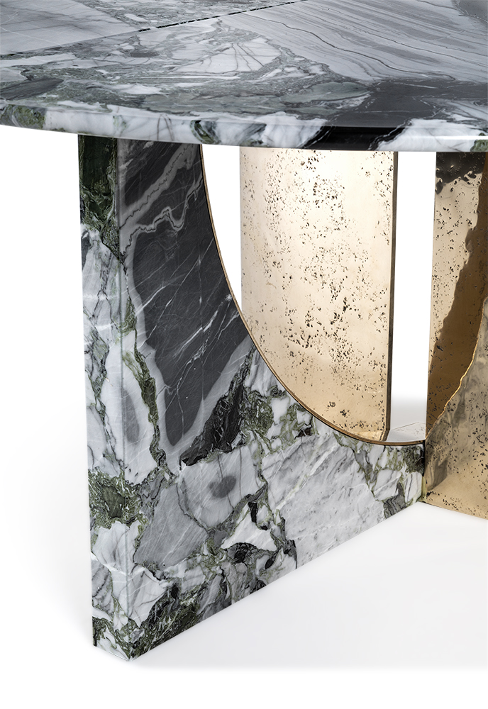The shapes of dining table Spinnaker take inspiration from elegance and lightness of the sails of the boats that are unfurled to the wind during the sailing. The marble top is available in one unique piece or it can be cut into three curved parts following the structural base with two arches that recall the typical geometry of architecture of the Thirties. The melted bronze parts of the base are realized by casting liquid metal into a mold made of special sand. The White Beauty marble creates a very strong chromatic contrast with the bronze shades of the metal, enhancing the refinement of all the materials used for this table.