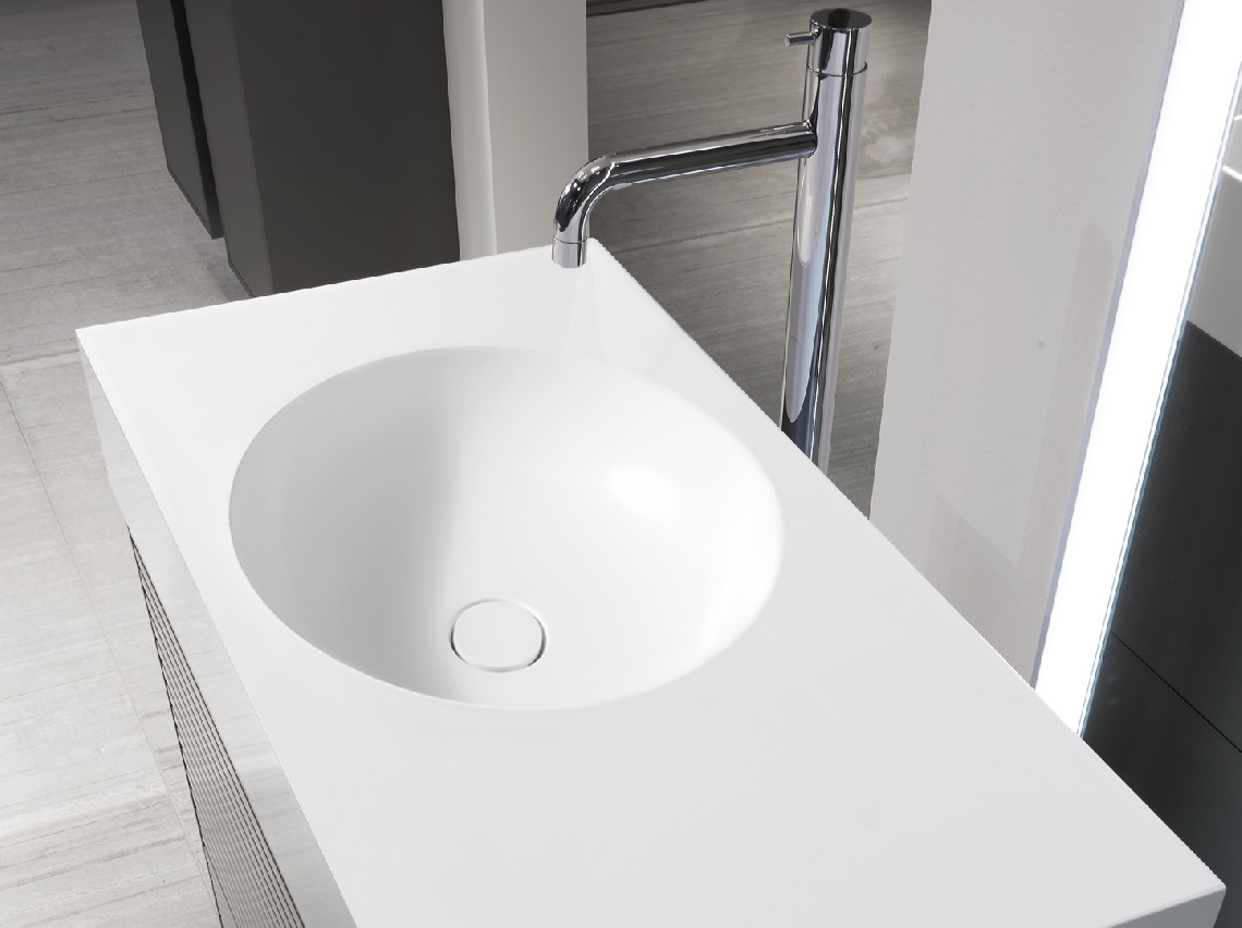 Lavabo da appoggio o semi incassato, in Monolith, senza troppo pieno, tappo piletta in Monolith.