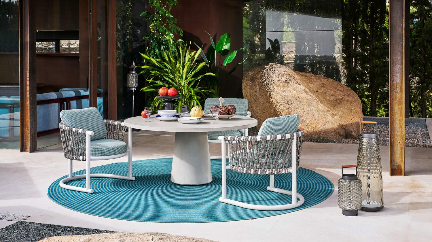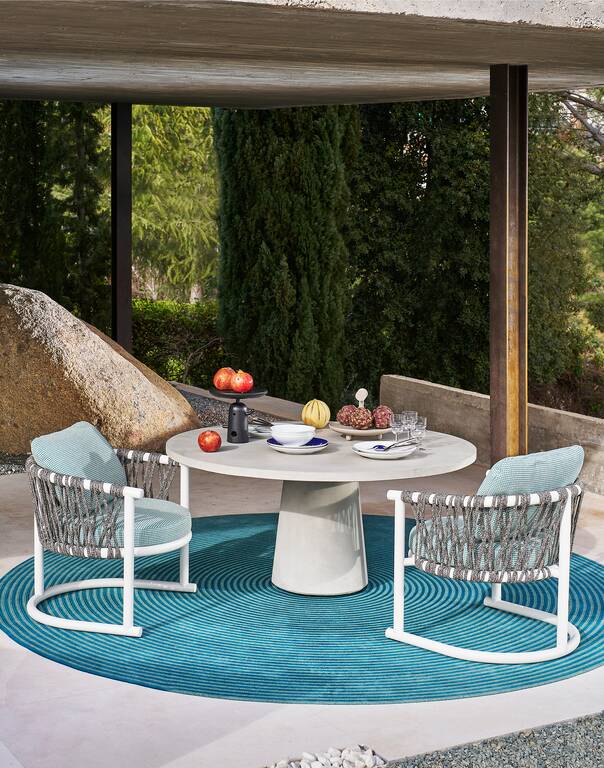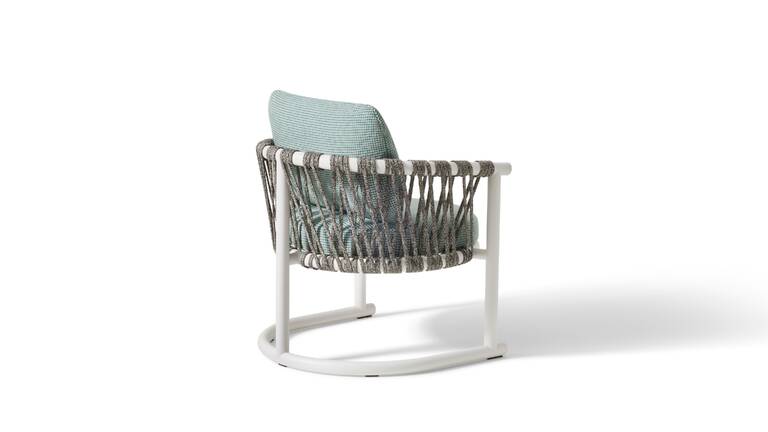 Patricia Urquiola設計的這款休閑扶手椅充滿地中海風情,與專為舒適的戶外生活而設計的家具系列相呼應,是對當代休閑生活的高雅邀請。鋁管椅面和靠背上纏繞著手工編織的聚丙烯繩。柔軟的可拆卸座墊底部由三條尼龍搭扣帶進行固定。在無編織款式中,靠墊通過拉鏈與座墊相連,并由兩條聚丙烯帶通過不銹鋼按扣掛在框架上。