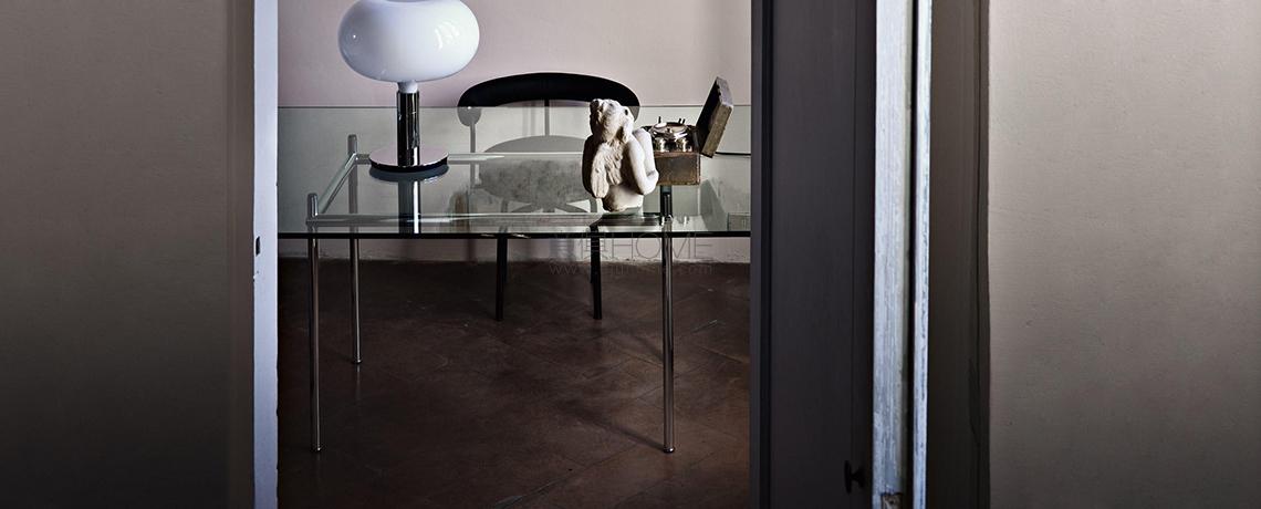 Questo tavolo, disegnato da Le Corbusier e Pierre Jeanneret nel 1925 per la Maison La Roche a Parigi, è caratterizzato dal contrasto audace tra i due componenti principali: il sostegno e il sostenuto. Il piedistallo, ridotto al minimo di larghezza per la sua forma verticale, si erige contro la superfice estesa del piano orizzontale creando un’antitesi dimensionale già esplorata da Le Corbusier in altre opere. Il valore plastico e poetico di questo esemplare deriva dunque da un’inversione di ruolo delle parti che oppone la leggerezza vibrante del piano al suo vero peso, e la stabilità rassicurante del piedistallo alle sottili linee visive.