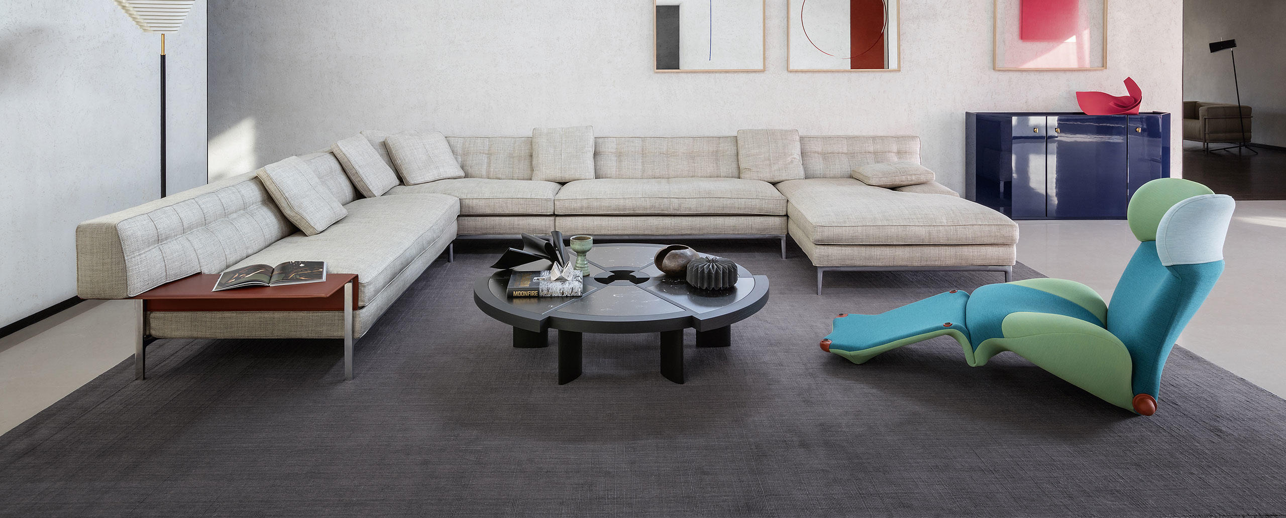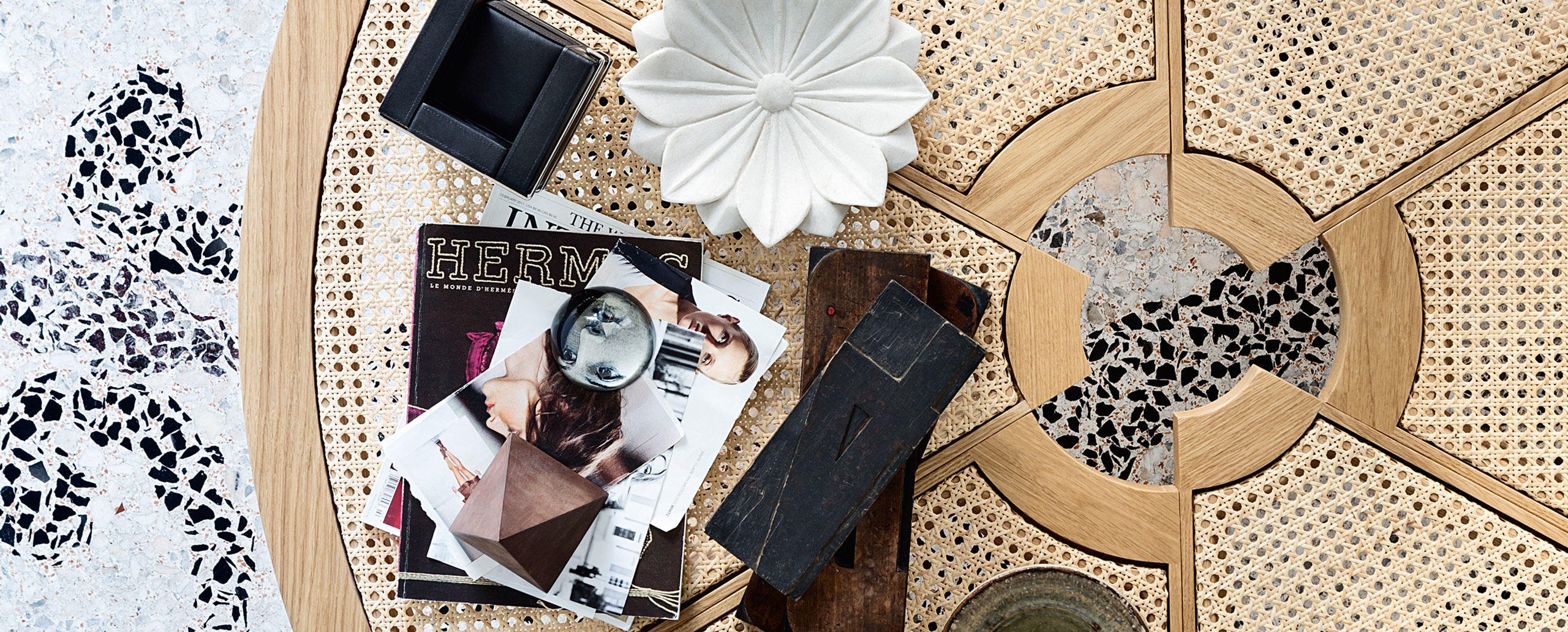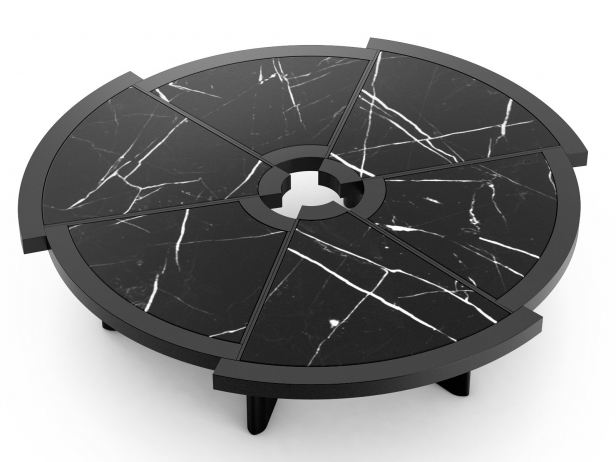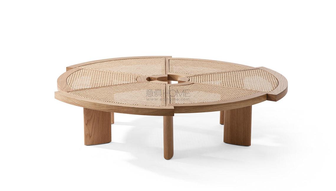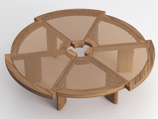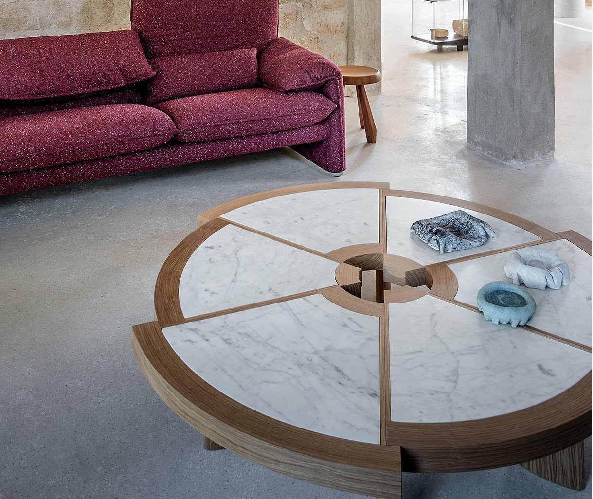 Attualmente disponibile in una sola misura, il tavolino Rio fu inizialmente ideato dalla Perriand in due diverse dimensioni. Tra il 1962, anno di progettazione, e il 1967 l’autrice adattò il modello e ne ampliò il volume per la versione destinata all’Ambasciata del Giappone a Parigi. La sua bellezza inconsueta e la sua grande funzionalità lo rendono una vera e propria opera di decoro, caratterizzata da sei spicchi di diverso raggio, accostati ma sfalsati, che creano un bordo esterno in massello articolato e un foro centrale concepito come centro di gravità spaziale. Cassina riedita il modello originale del 1962, riproducendolo nella forma originale grazie alla straordinaria capacità manuale degli artigiani di Meda.