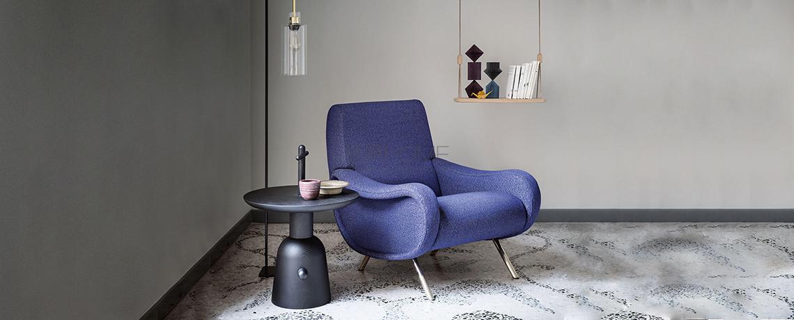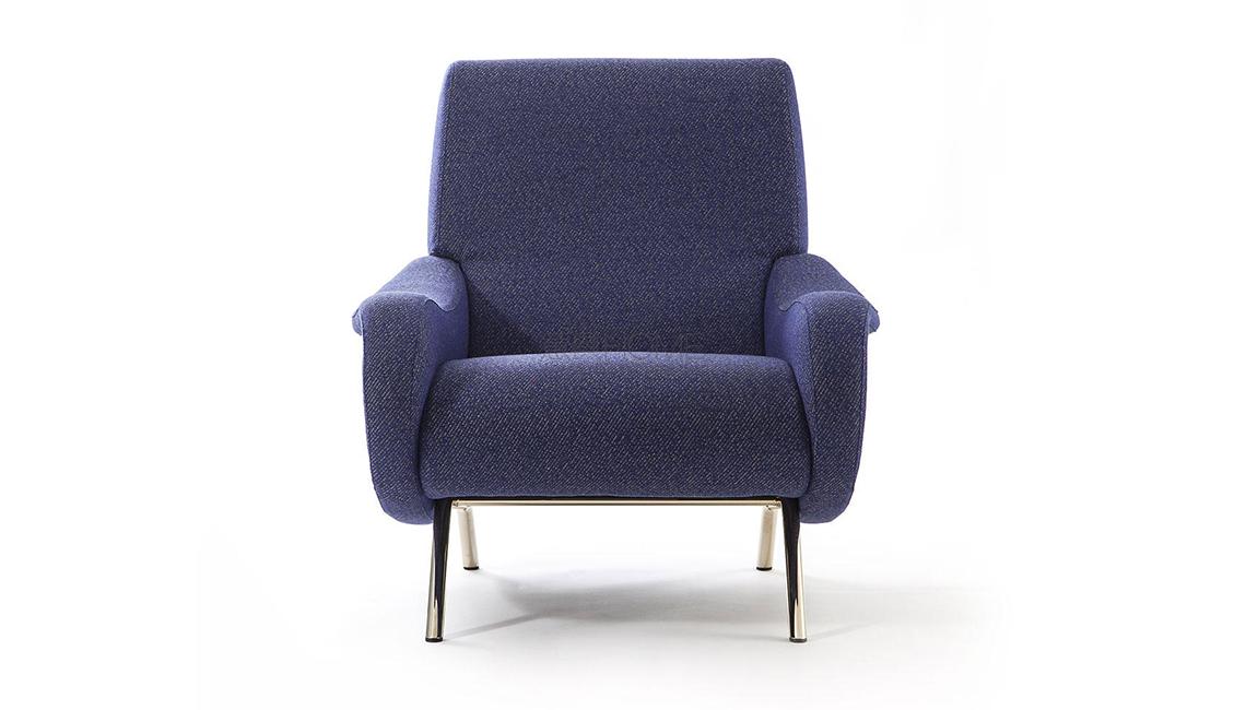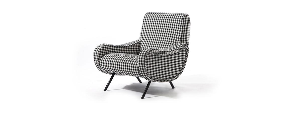 Come per la poltrona, è disponibile un’ampia selezione di tessuti e un’edizione iconica con rivestimento quadrettato bianco e nero e piedi verniciati basalto opaco.