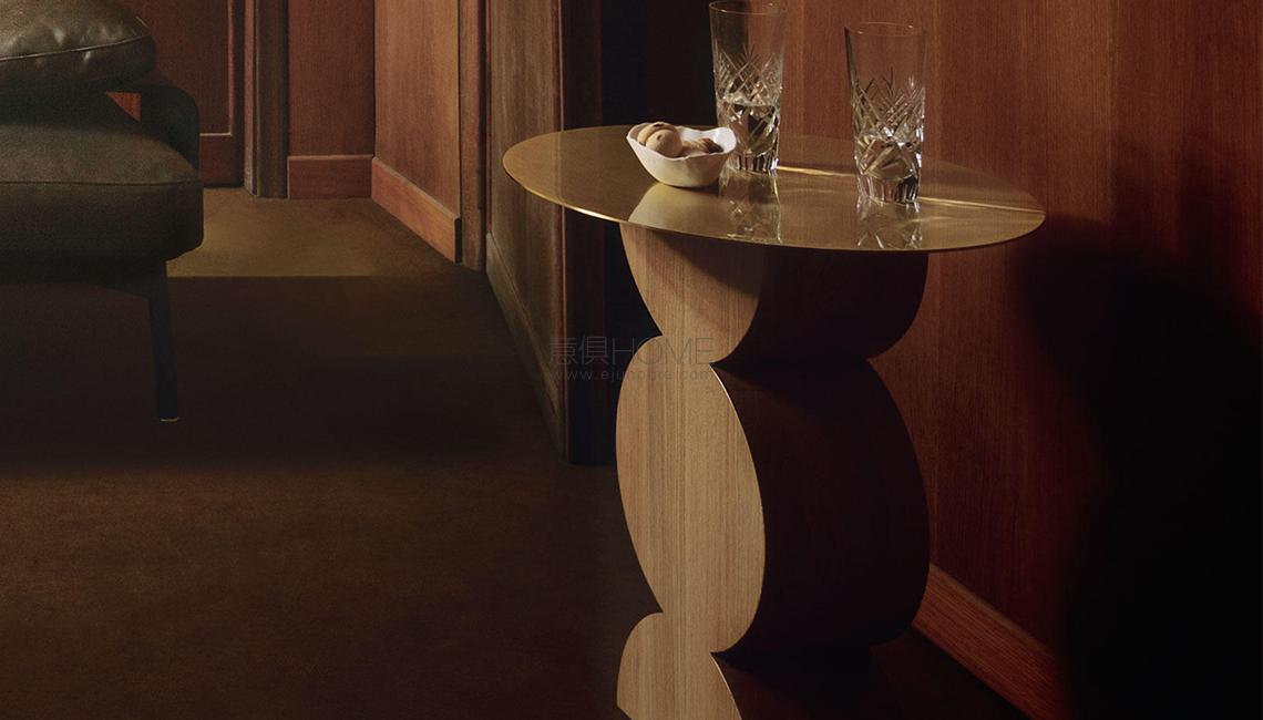 Un’opera d’arte attualmente inclusa nella collezione Ultramobile, progettata da Studio Simon come omaggio al lavoro di Constantin Brancusi. Dall’universo dello scultore rumeno sono stati ripresi due elementi producibili in serie, abbinati in un insieme perfetto che conferisce alla struttura un’elegante sensazione di movimento e continuità. Il tavolino è realizzato con una base in legno massiccio di rovere rifinita a cera, mentre il piano presenta un profilo circolare in lamina di ottone.
