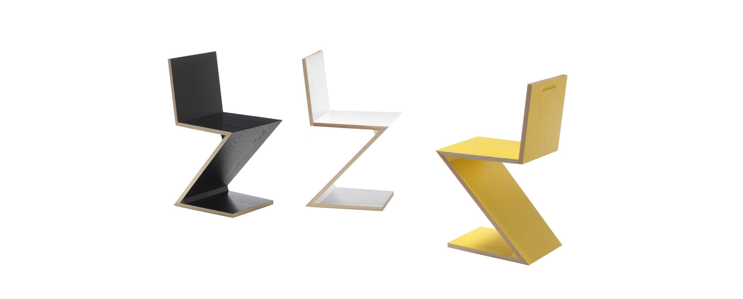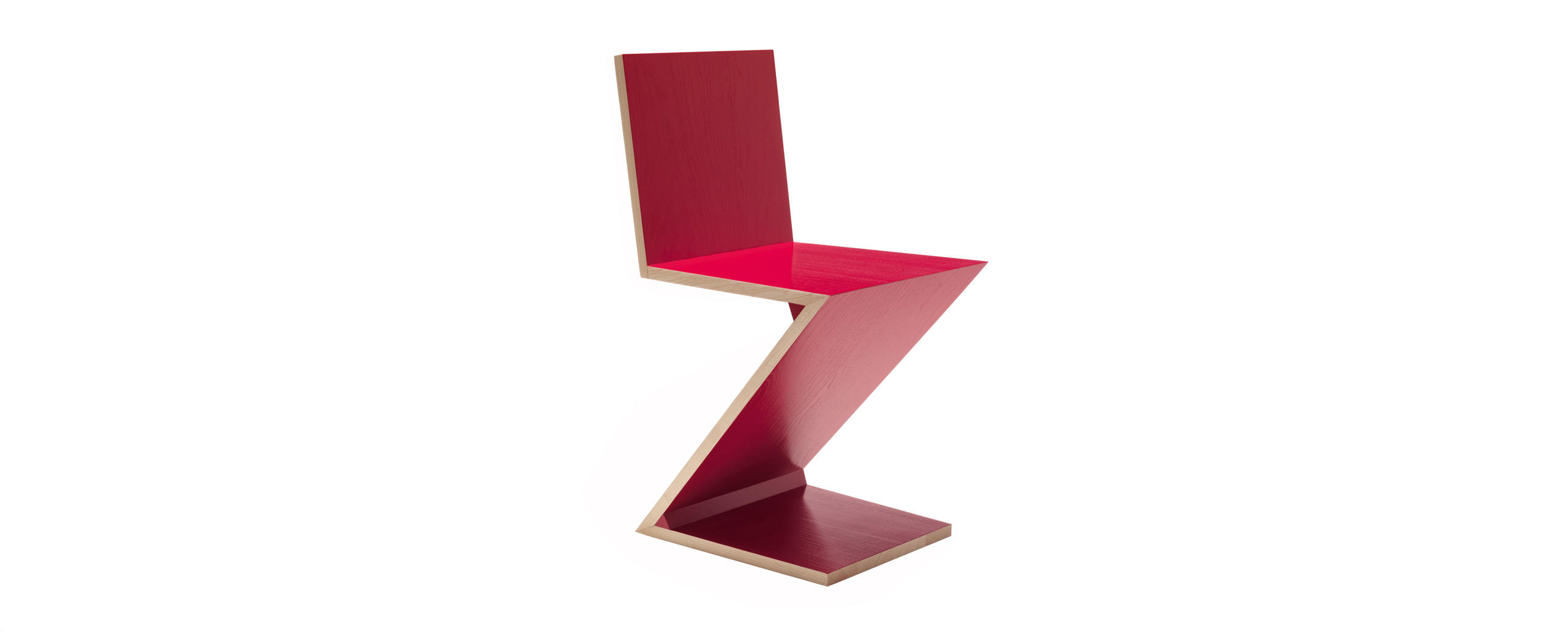 La sedia progettata da Rietveld rappresenta uno dei primi esempi di seduta a sbalzo, formata da quattro piani in sequenza ritmica che si sviluppano in un’apparente instabilità di grande raffinatezza. Il maestro sostituisce la normale successione degli elementi - gambe-seduta-schienale – con un foglio continuo in legno a forma di zeta rovesciata. La maestria costruttiva dei falegnami di Cassina si rivela nell’esecuzione degli incastri a coda di rondine che valorizzano la struttura. L’unicità estetica dell’oggetto si percepisce in modo particolare nella versione colorata con finitura a poro aperto che esalta le venature del legno nei piani e nelle sezioni laterali; un trattamento che riprende alcune varianti realizzate dall’architetto per valorizzare il rapporto tra linee verticali, oblique e orizzontali.
