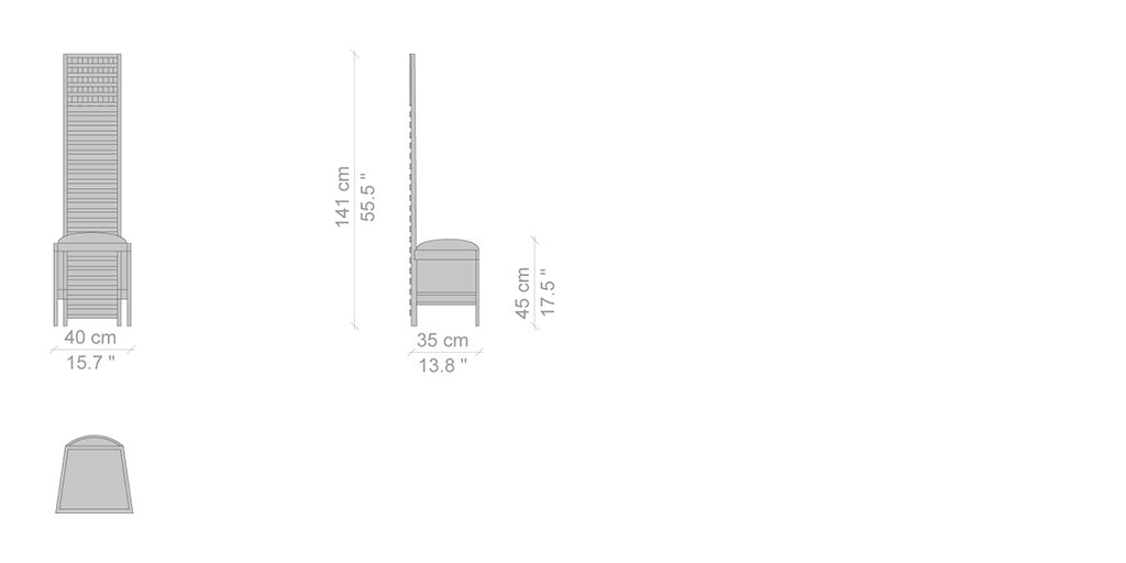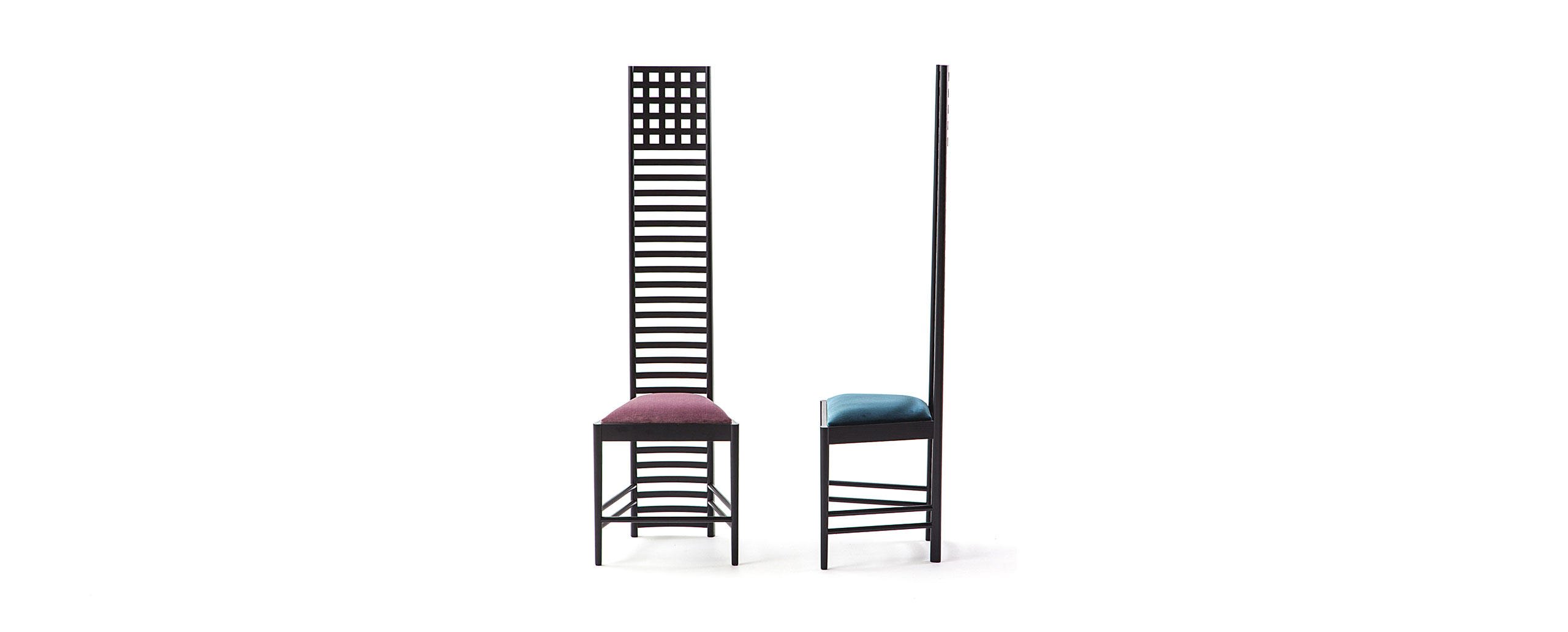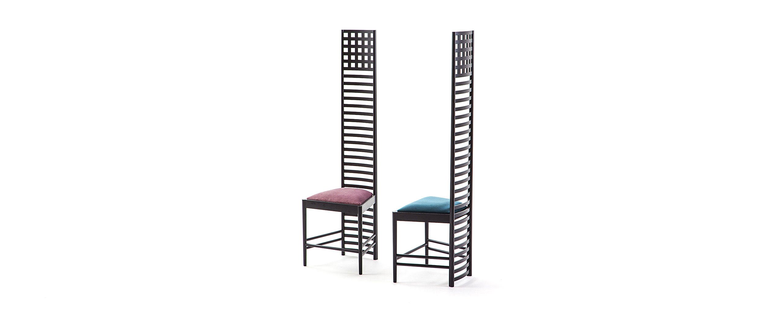 Una sedia iconica che riflette appieno lo stile del maestro e la sua inclinazione ad abbracciare le più complesse sfide produttive. Il pezzo nasce come complemento d’arredo per uno dei maggiori progetti realizzati da Mackintosh, la Hill House in Scozia, da cui prende il nome. La forma lineare e geometrica rievoca i tratti minimali e il grafismo astratto del design giapponese, integrando valori simbolici e figurativi nella personalità scenica dell’oggetto. Per molti non solo una sedia ma un autentico trattato di articolazione spaziale, dove lo schienale alto è definito dalla successione di linee verticali che culminano in un graticcio di ritti e pioli, con sezioni al limite della resistenza materica. Cassina la riedita grazie alla straordinaria maestria degli ebanisti di Meda, offrendola nella versione in frassino tinto nero con sedile in velluto.