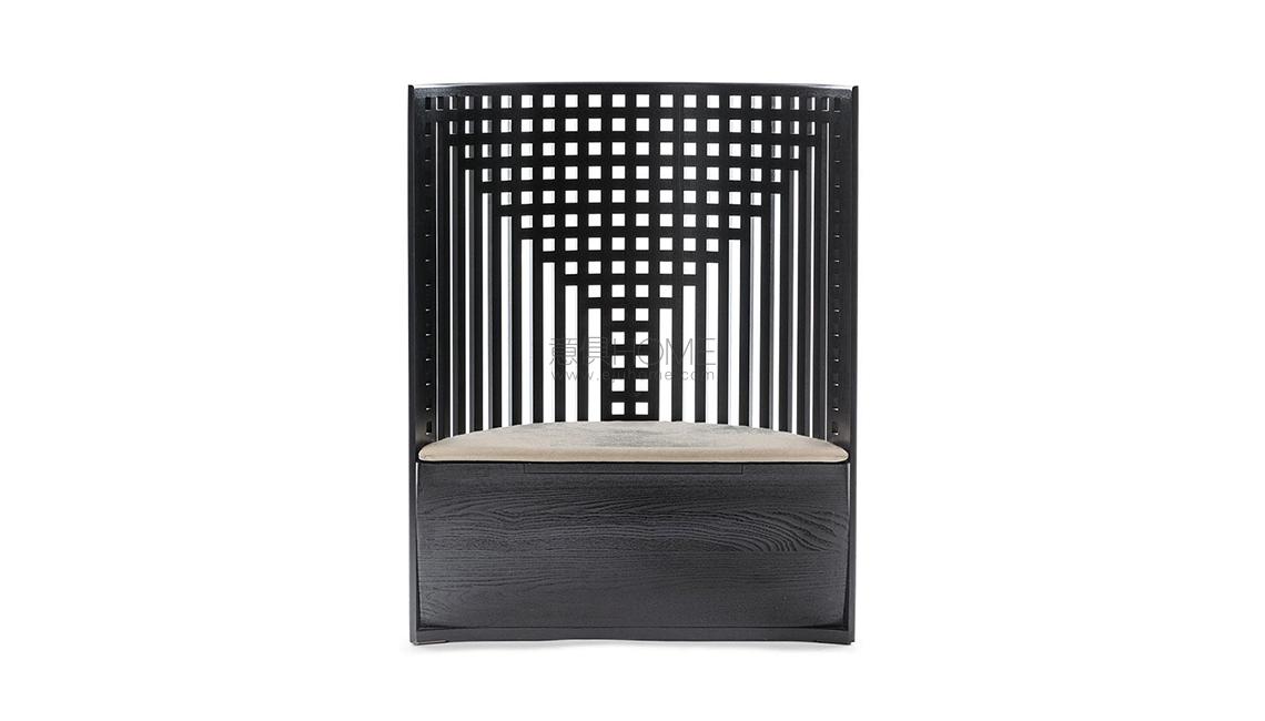 Questa poltrona-tronetto è una riedizione del modello che l’architetto scozzese donò nel 1904 al locale “Willow Tea Room”di Glasgow, sua città natale. La spalliera alta e semicircolare aveva la funzione di divisorio tra l’anticamera e la sala posteriore. Lo schienale avvolge il sedile raffigurando perfettamente lo stile geometrico e floreale di Mackintosh. La realizzazione di questa seduta coniuga la tecnologia avanzata e l’alta ebanisteria di Cassina, particolarmente riconoscibile nella precisione artigianale con cui vengono assemblati i componenti per creare la struttura leggera e raffinata.