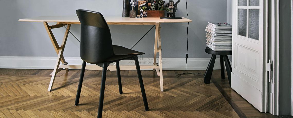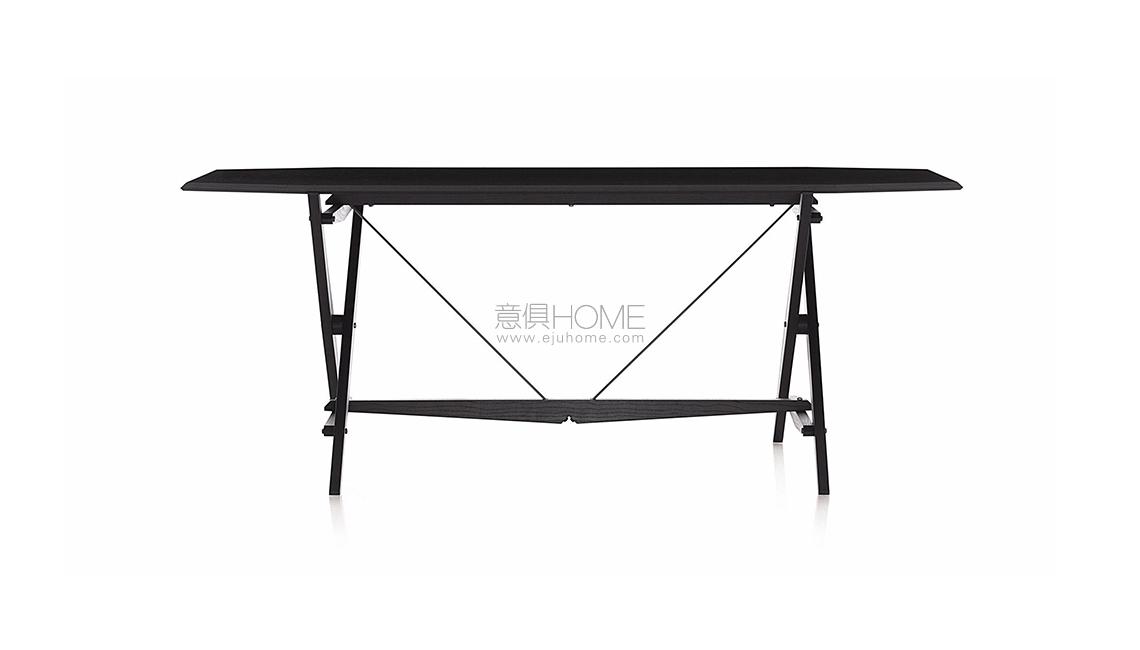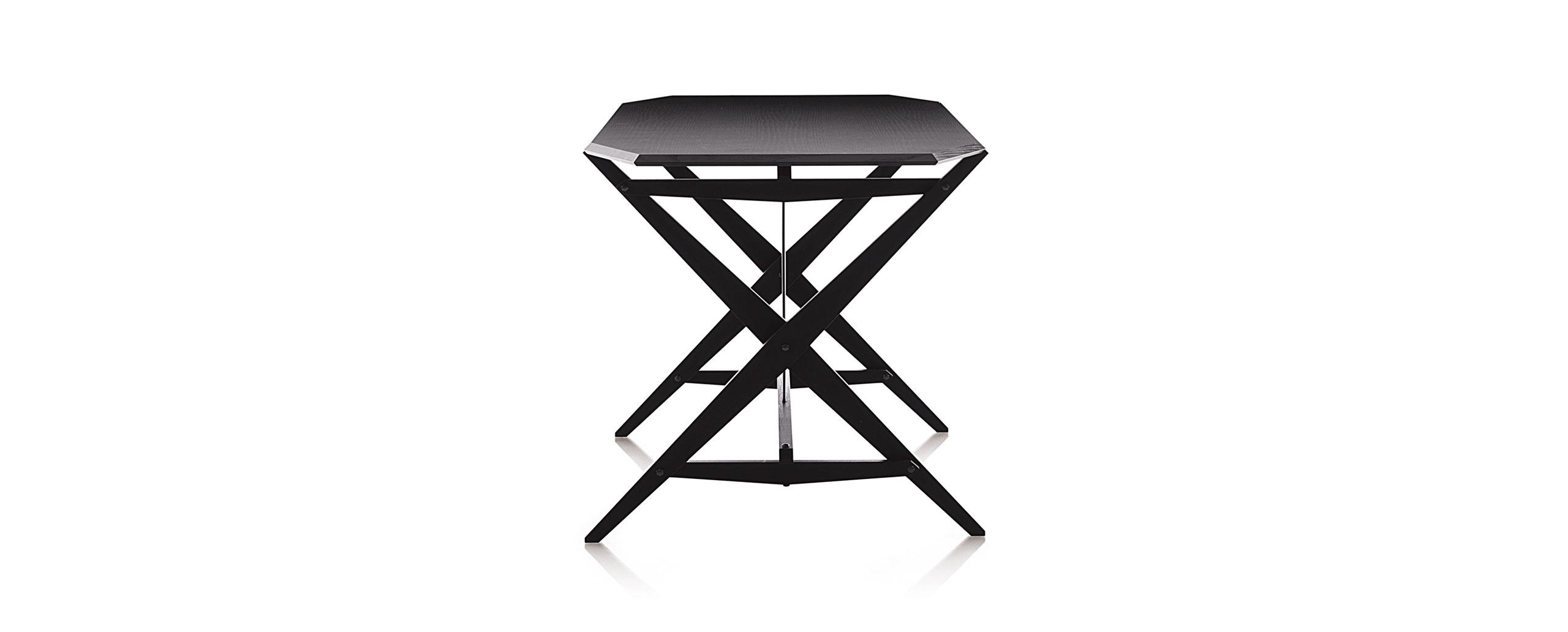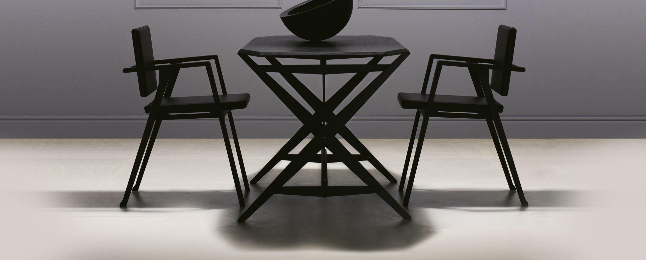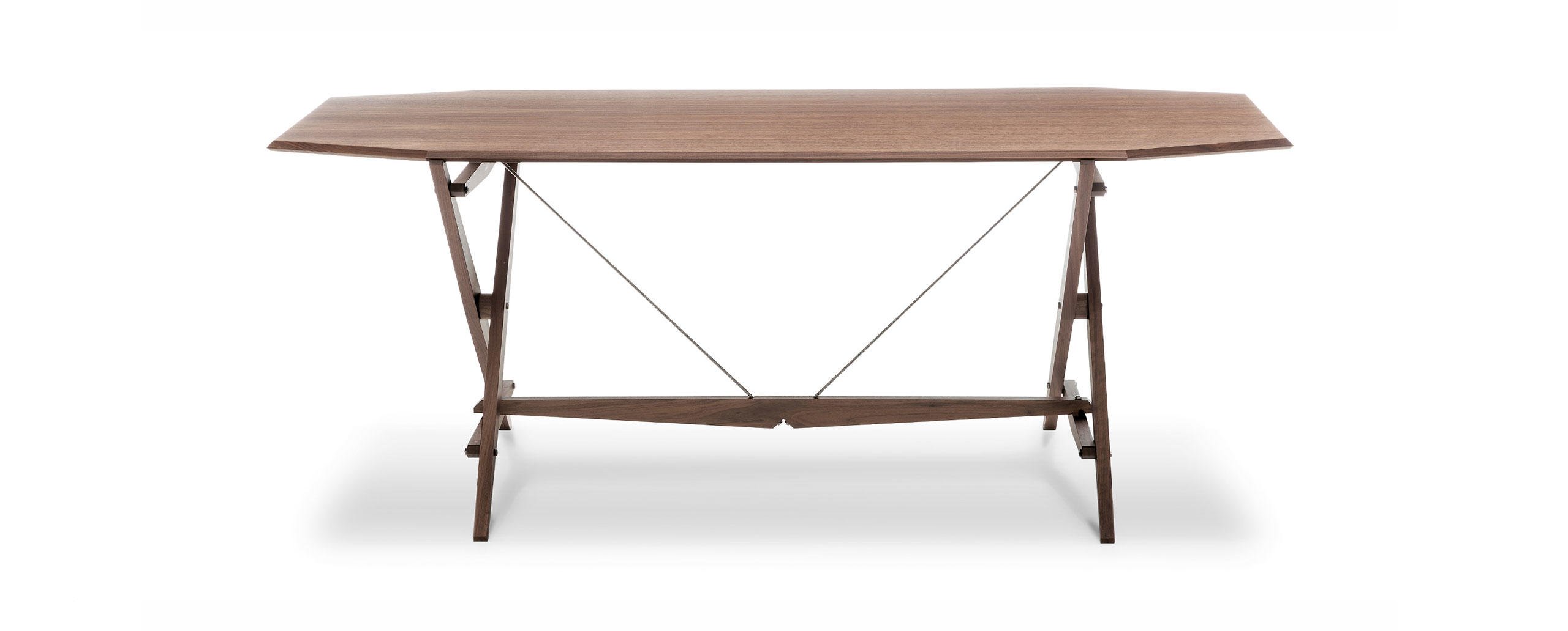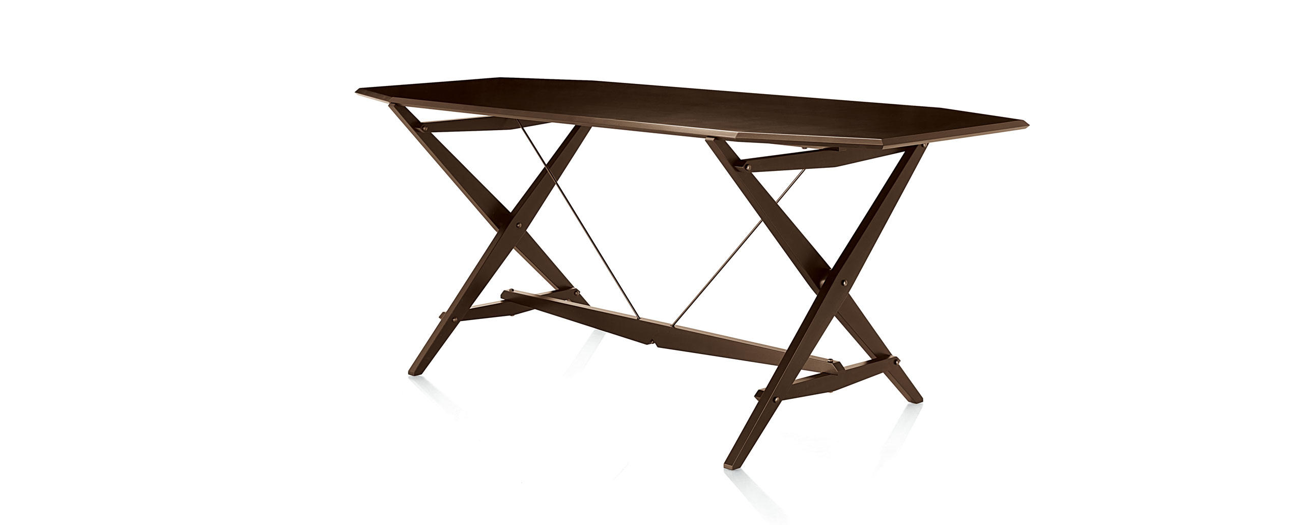 Un tavolo dalle forme minimali e dall’aspetto estremamente leggero, che mette in luce la ricerca rigorosa compiuta dal maestro e la sapienza avanzata dell’azienda nella lavorazione del legno. La struttura basata sulle tensioni contrapposte rivela un effetto di apparente provvisorietà ottenuto mediante la riduzione del volume e del peso degli elementi. Il pezzo è assemblato con due tiranti tenditori in ottone brunito che fungono anche da controventature. Il delicato processo di montaggio, realizzato a regola d’arte dai falegnami di Cassina, riassume l’eccellenza del MedaMade offrendo un’interpretazione formale estremamente raffinata. Una visione di eleganza in cui la cura dei dettagli è ulteriormente definita dalla minuteria metallica e dalla bordatura perimetrale del tavolo.