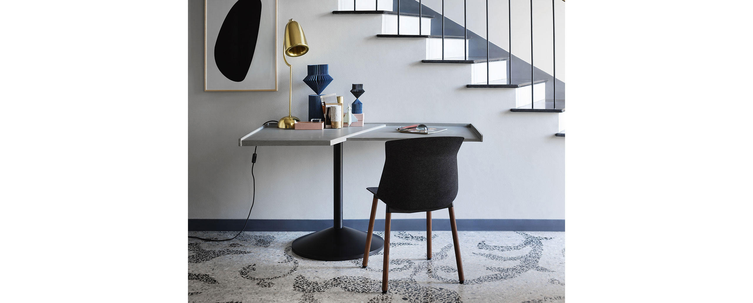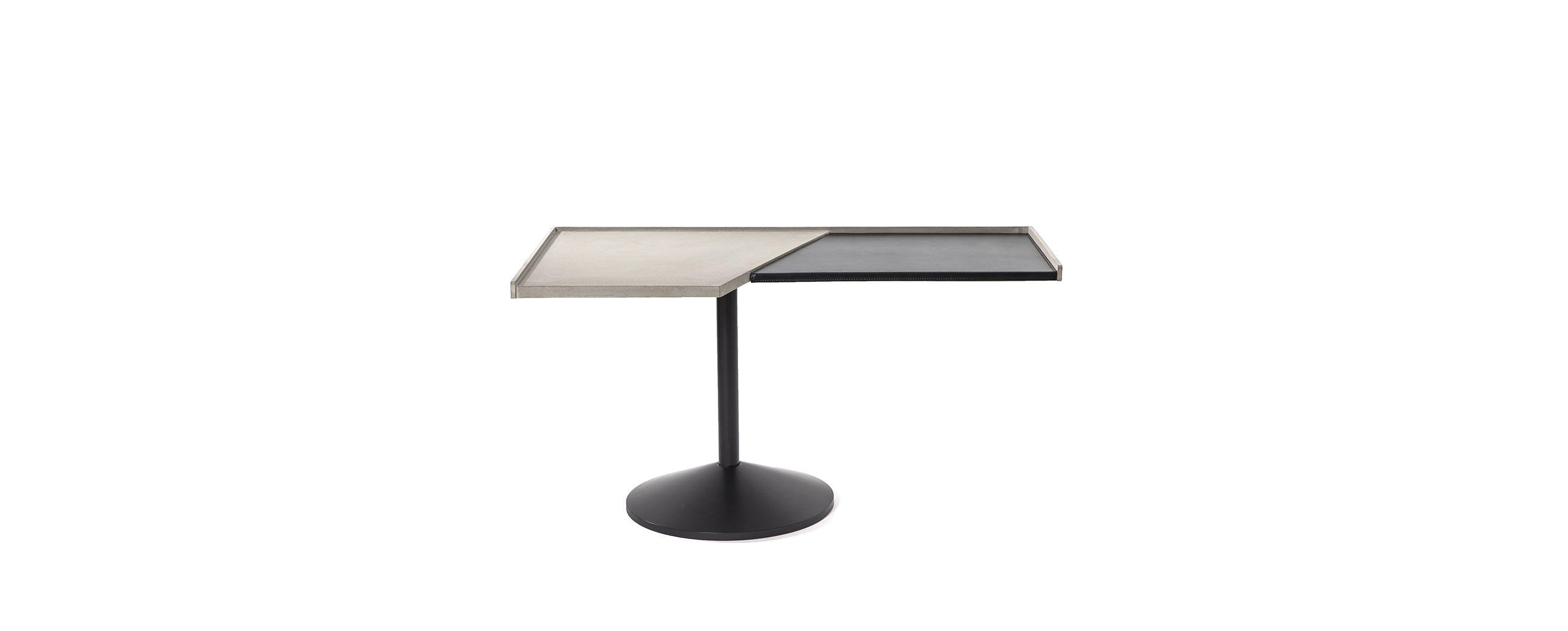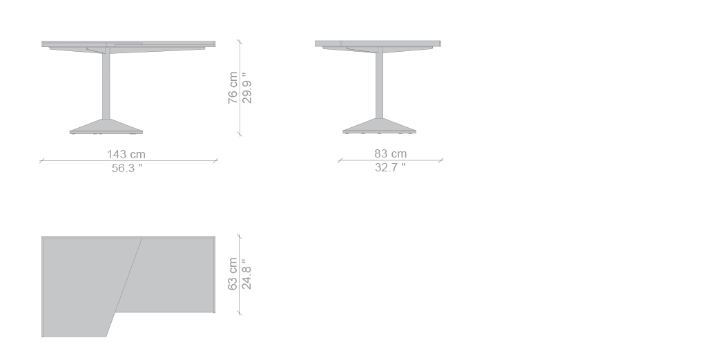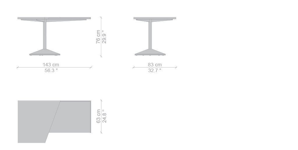 Il tavolo-scrittoio disegnato da Franco Albini è costituito da due piani accostati, uno principale e uno laterale, di forma trapezoidale, sorretti da un unico basamento in acciaio. Il gioco di equilibri è caratterizzato dalla ricchezza materica del piano, disponibile in tre diverse essenze di legno e in cemento naturale. In tutte le versioni i due piani hanno spessori differenti e una cornice che ne delimita i profili esterni. Il tavolo può essere fornito con una copertura in cuoio, da collocare sul piano principale per accentuare la ricercatezza tattile e visiva. La struttura con una sola gamba conferisce un effetto di apparente instabilità alla struttura, che attraverso l’equilibrio generato dalla diseguaglianza dei bracci evoca la forma della bilancia da cui prende il nome.