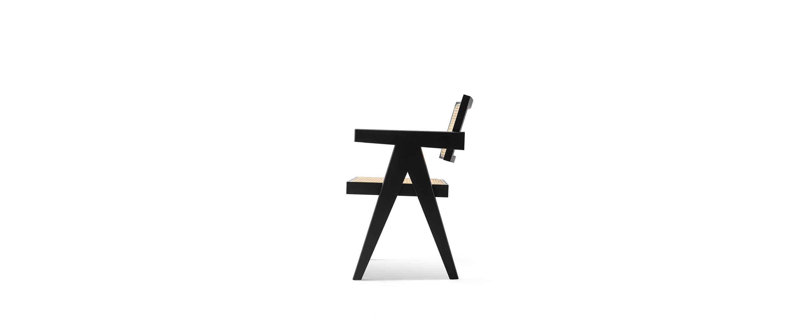Questa sedia è uno dei modelli più conosciuti tra gli arredi del Capitol Complex di Chandigarh e si trovava in diversi uffici amministrativi del palazzo del Secretariat. E’ costituita da elementi separati tra cui i sostegni laterali posizionati a forma di “V” rovesciata per convergere a sostenere il bracciolo anch’esso in massello. L’impagliatura del sedile e dello schienale all’interno di un telaio in legno sono invece elementi caratteristici dello spirito del luogo, espresso anche nell’uso di legni locali come il teak. In coerenza con la più conosciuta Office Chair, la sedia senza braccioli utilizza anche essa la tipologia a “V” degli appoggi, in tal caso più ridotti poiché non si estendono sino al bracciolo. In essa la priorità è data alla sequenza sedile -schienale in paglia di Vienna, posti in continuità e uniti da due profili in legno dalla massiccia sezione geometrica, elementi che strutturano, con le gambe complanari, un insieme possente e semplice allo stesso tempo. La riedizione Cassina propone oltre alla storica versione in teak, due versioni in rovere naturale e tinto nero.