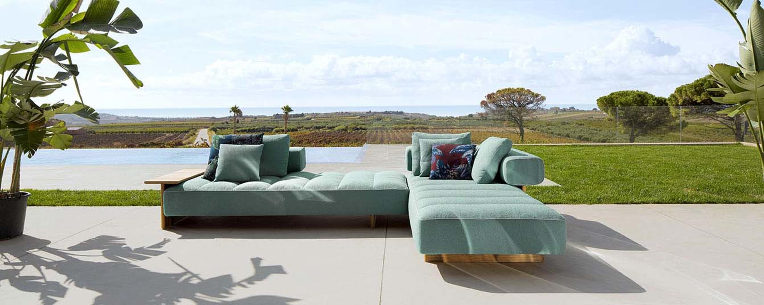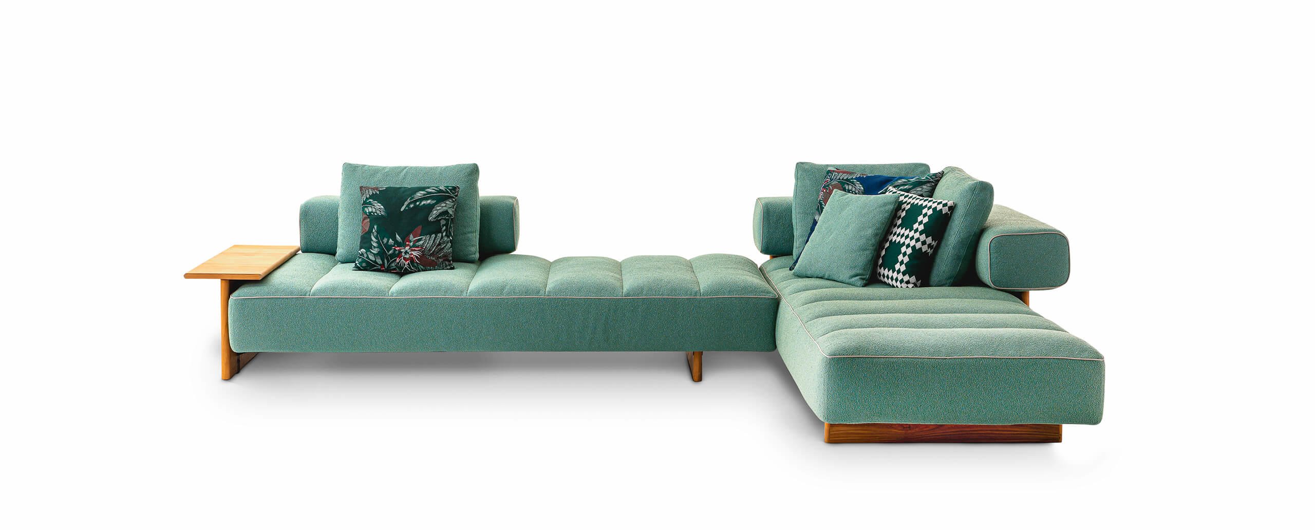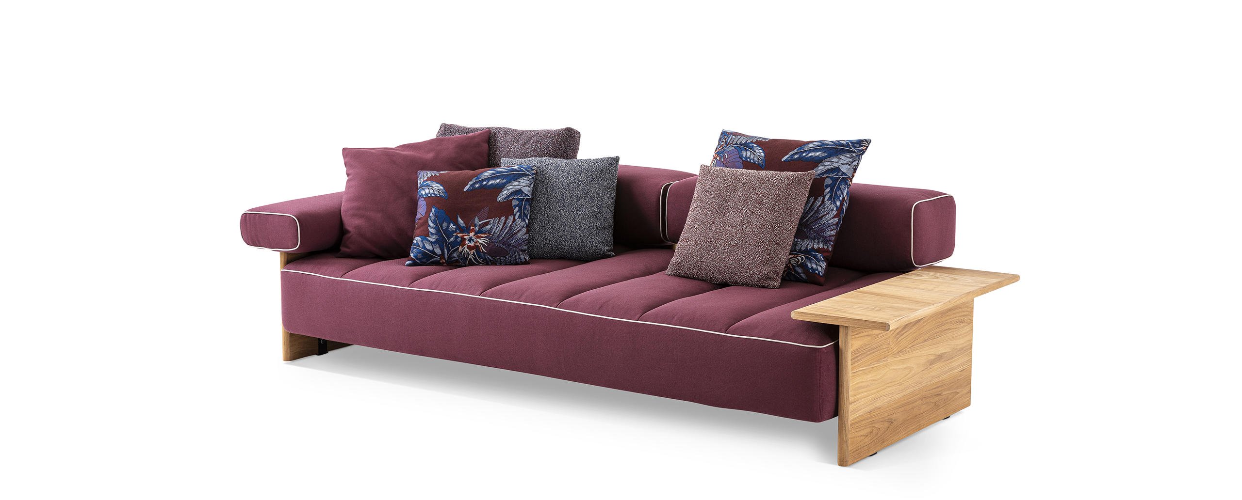 Ispirato allo spirito della villeggiatura degli anni 50, Sail Out è un divano componibile da esterno che ricorda la forma morbida dei materassini gonfiabili in tela grazie alle singole fasce con imbottitura estraibile inserite in tasche cucite singolarmente. Vanta dettagli sartoriali, come il profilo in gros-grain grigio o nello stesso tessuto del divano, e un comfort elevato dato dall’utilizzo nell’imbottitura di SoloSoff?, un prodotto a base di fibra di poliestere soffiata e memory foam. Versatile e funzionale, con un telaio in metallo, Sail Out offre un’infinita varietà di combinazioni grazie a tre moduli per la seduta – con 5, 6 o 7 fasce – e a tre elementi correlati: il tavolino in teak e il bracciolo/schienale, in due altezze, sono intercambiabili, grazie a un meccanismo di incastro sui pannelli in teak della struttura che ricorda quello dei poggiatesta delle automobili. Il divano è arricchito da un pouf rotondo, in due misure, costituito da spicchi che convergono in un piccolo vuoto nascosto per far defluire l’acqua. Appoggiato sul pouf, un cuscino zavorrato può sorreggere un vassoio oppure essere usato come bracciolo. Completa la collezione un tavolino basso.