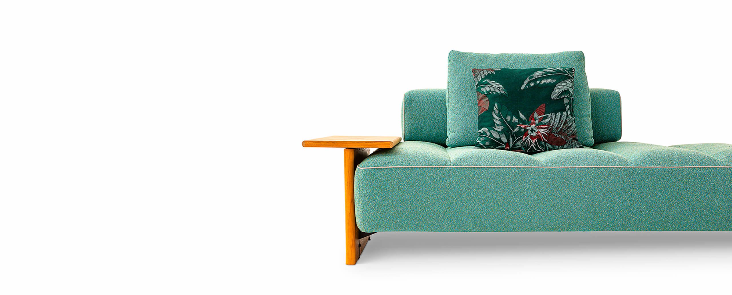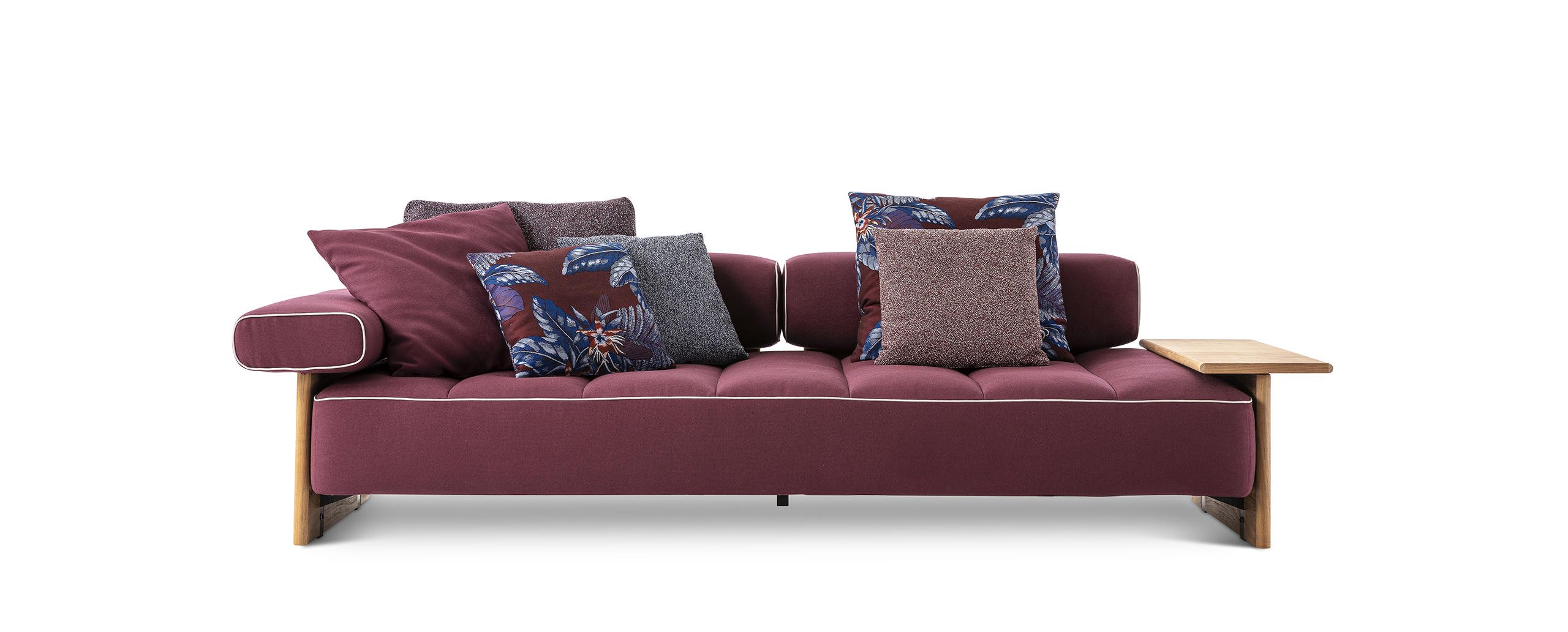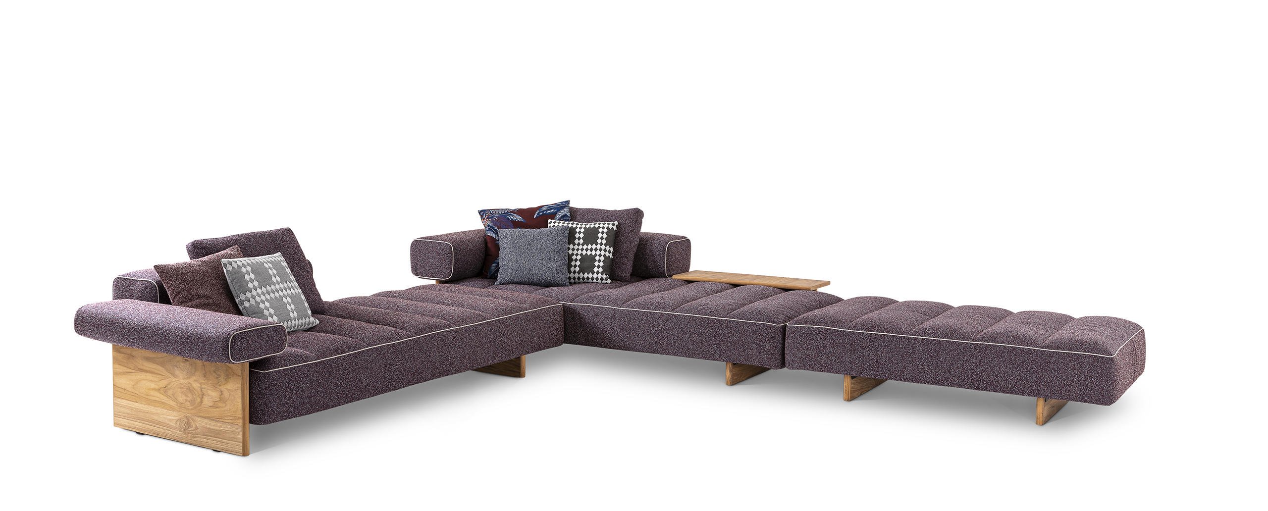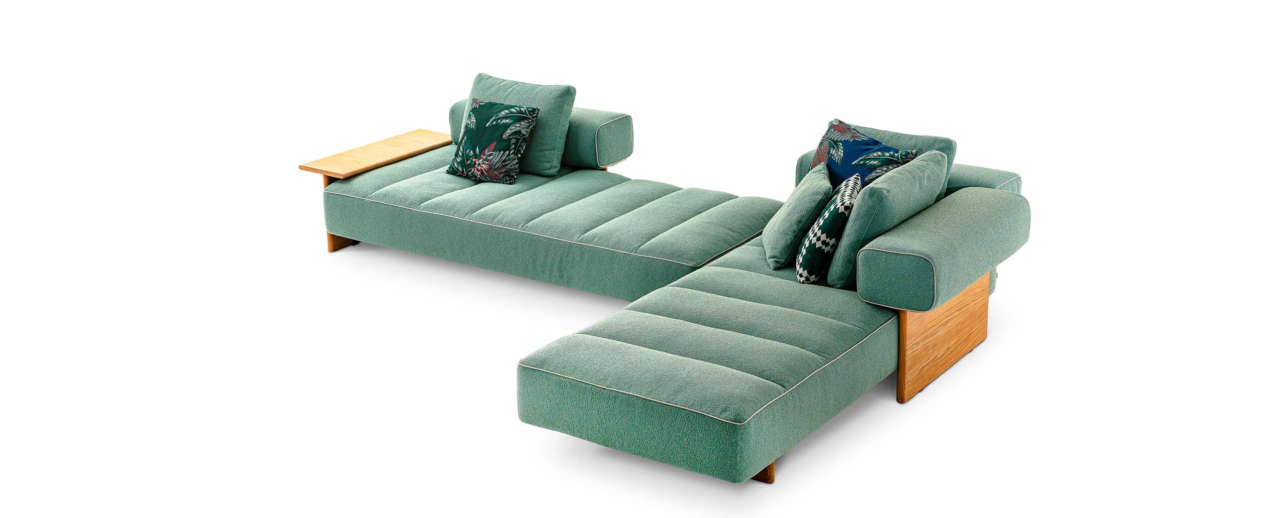 Ispirato allo spirito della villeggiatura degli anni 50, Sail Out è un divano componibile da esterno che ricorda la forma morbida dei materassini gonfiabili in tela grazie alle singole fasce con imbottitura estraibile inserite in tasche cucite singolarmente. Vanta dettagli sartoriali, come il profilo in gros-grain grigio o nello stesso tessuto del divano, e un comfort elevato dato dall’utilizzo nell’imbottitura di SoloSoff?, un prodotto a base di fibra di poliestere soffiata e memory foam. Versatile e funzionale, con un telaio in metallo, Sail Out offre un’infinita varietà di combinazioni grazie a tre moduli per la seduta – con 5, 6 o 7 fasce – e a tre elementi correlati: il tavolino in teak e il bracciolo/schienale, in due altezze, sono intercambiabili, grazie a un meccanismo di incastro sui pannelli in teak della struttura che ricorda quello dei poggiatesta delle automobili. Il divano è arricchito da un pouf rotondo, in due misure, costituito da spicchi che convergono in un piccolo vuoto nascosto per far defluire l’acqua. Appoggiato sul pouf, un cuscino zavorrato può sorreggere un vassoio oppure essere usato come bracciolo. Completa la collezione un tavolino basso.