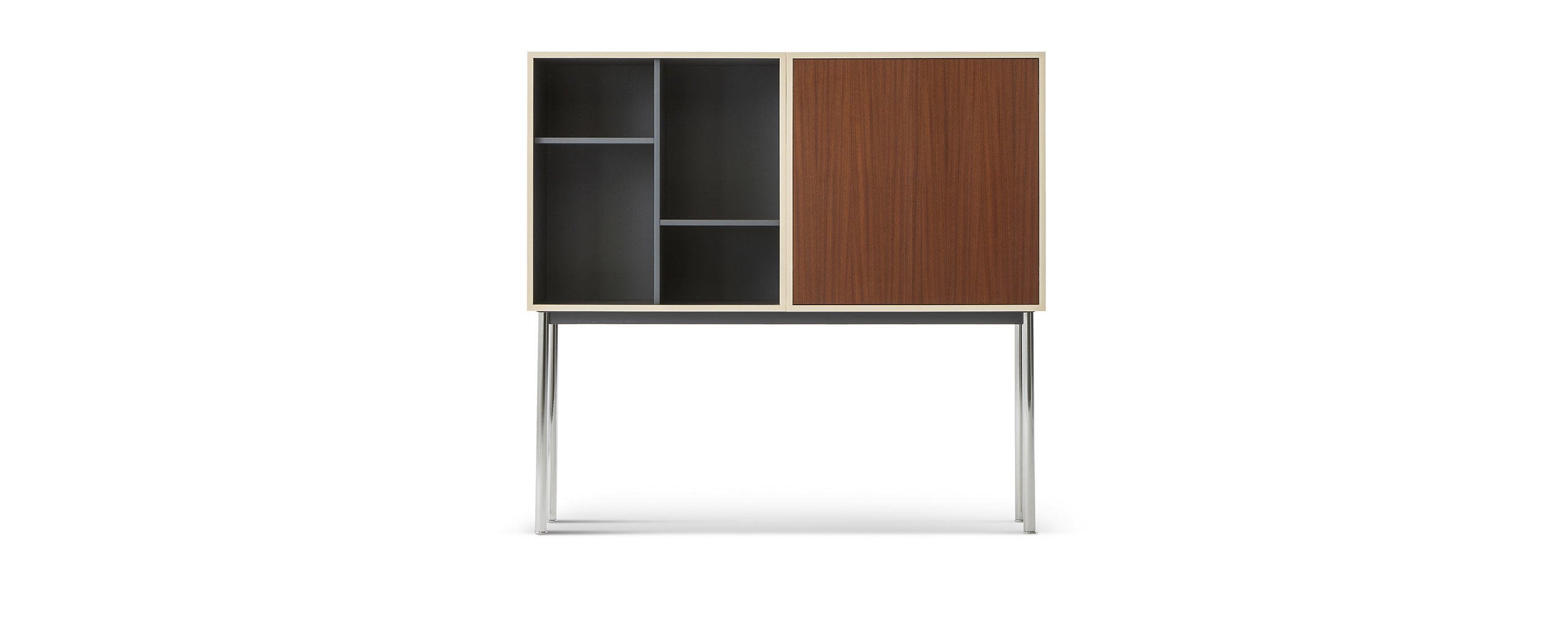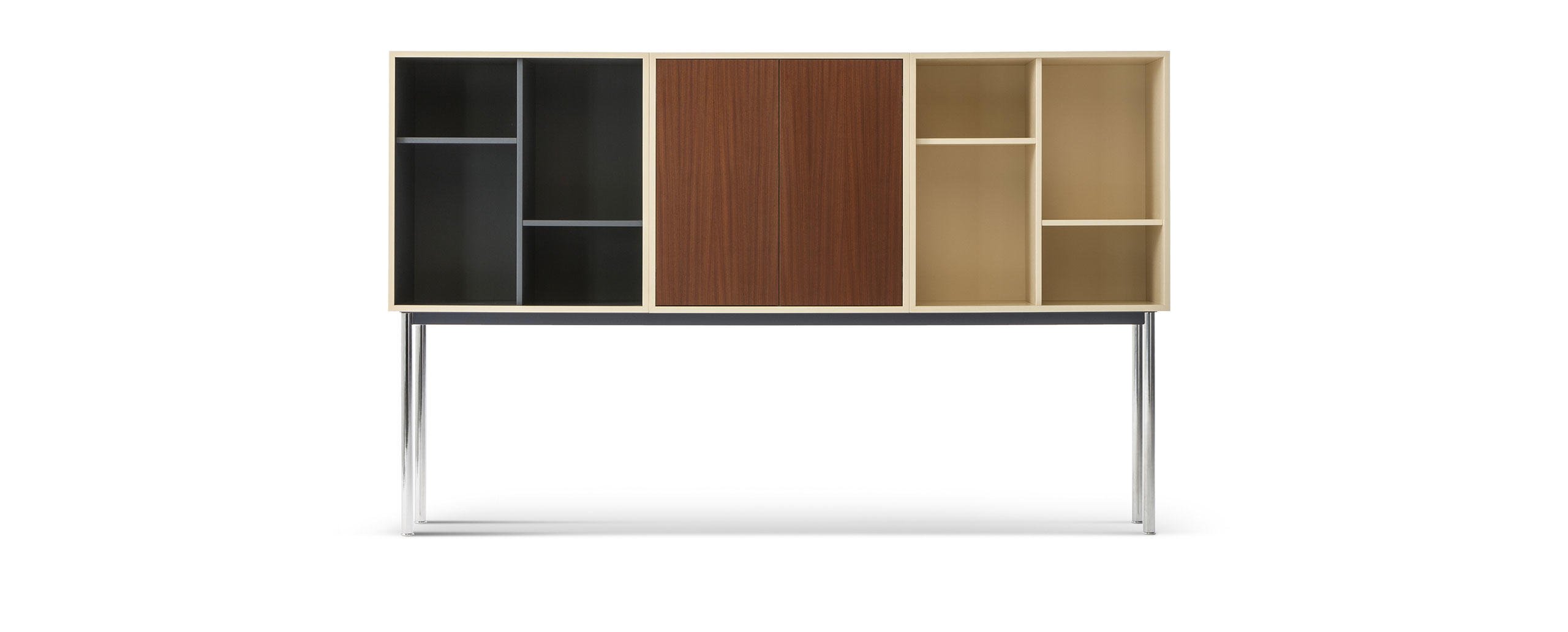 I Casiers Standard fanno parte del progetto di alloggio realizzato nel 1925 con Pierre Jeanneret per il Pavillon de l’Esprit Nouveau, con cui il maestro supera il concetto tradizionale di arredamento introducendo, accanto a selezionati arredi mobili, questi nuovi contenitori modulari e componibili. Elementi dal design unico e intramontabile, capaci di organizzare architettonicamente l’ambiente, adatti a riporre ogni oggetto a seconda dello spazio formando vere e proprie pareti attrezzate. I Casiers Standard sono stati rilanciati nel 2016 con una veste contemporanea caratterizzata da nuovi accorgimenti che valorizzano la qualità intrinseca dell’oggetto esaltando le sue caratteristiche di versatilità e funzionalità. I contenitori sono attualmente proposti in 18 composizioni fisse basate sul modulo standard 75x75x37,5 dotate di ripiani regolabili in 5 posizioni e di due tipologie di sostegno: quattro esili supporti cromati (pilotis) o due basi a corolla verniciate.
