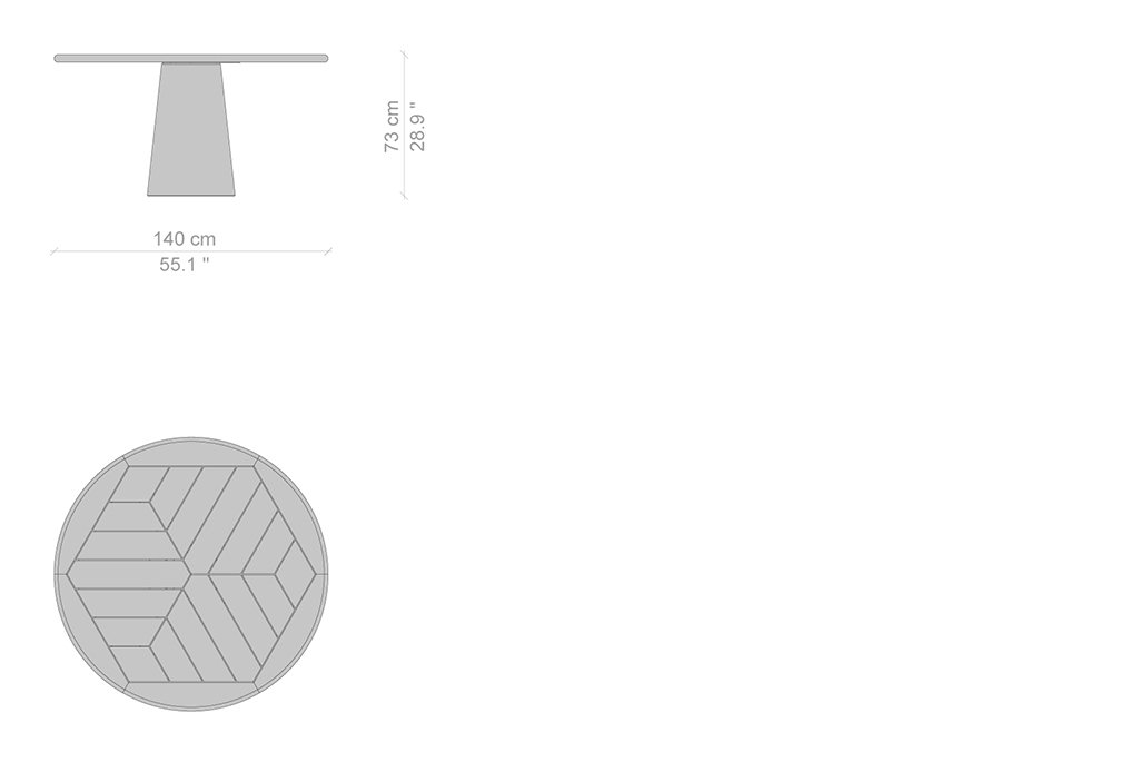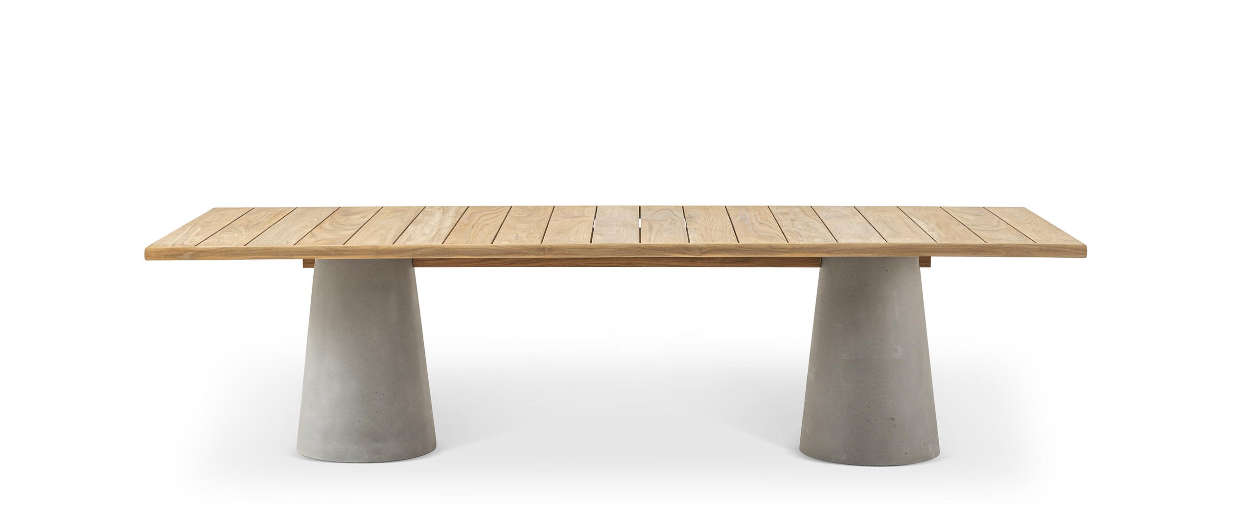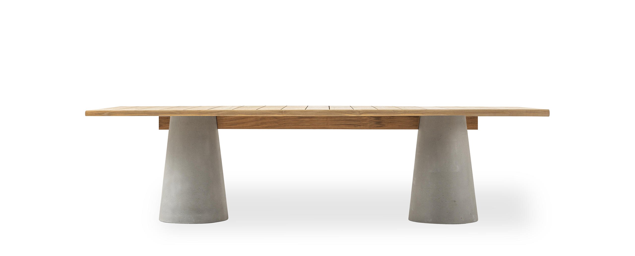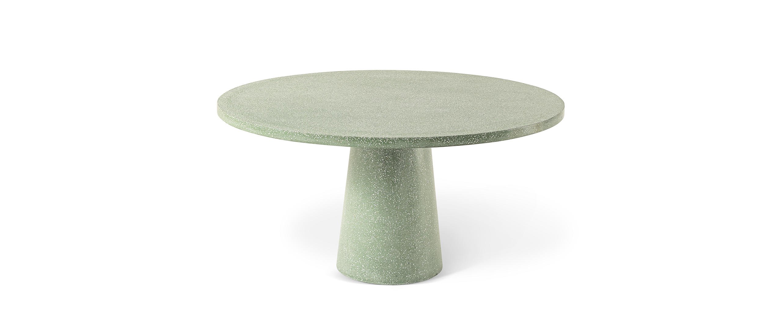 La famiglia di tavoli Dine Out si distingue per lo stile sofisticato. La base del tavolo tondo è costituita da una singola forma conica disponibile in cemento, con il piano in cemento o in doghe di massello di teak che convergono verso il centro, oppure in terrazzo giallo-bianco o verde-bianco con il piano dello stesso materiale o in teak a contrasto. Due elementi conici – in terrazzo giallo-bianco, verde-bianco o cemento – caratterizzano la versione rettangolare del tavolo, che presenta il piano in solo massello di teak, in due misure. Completa la collezione una sedia.