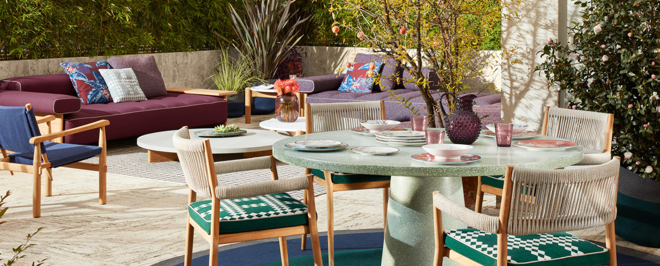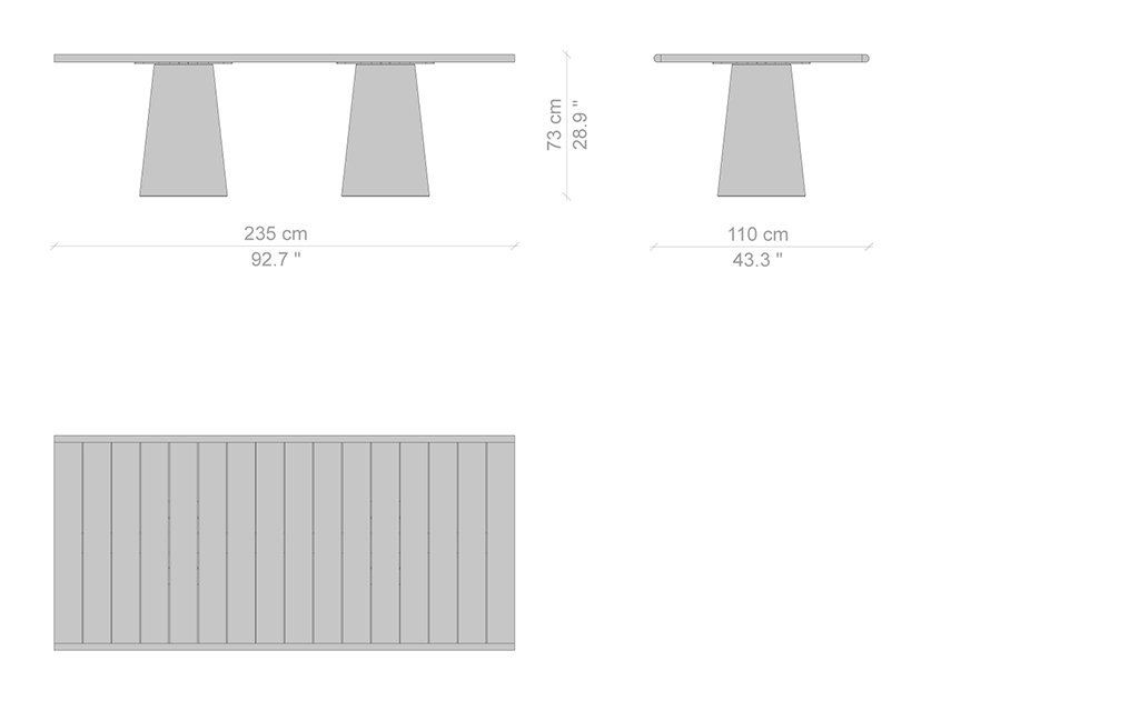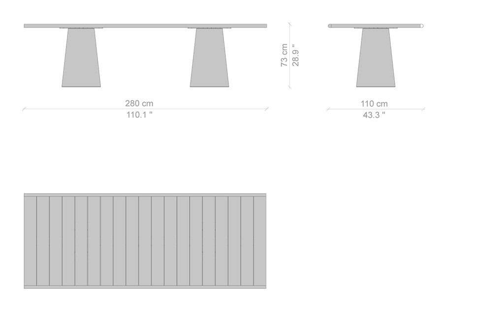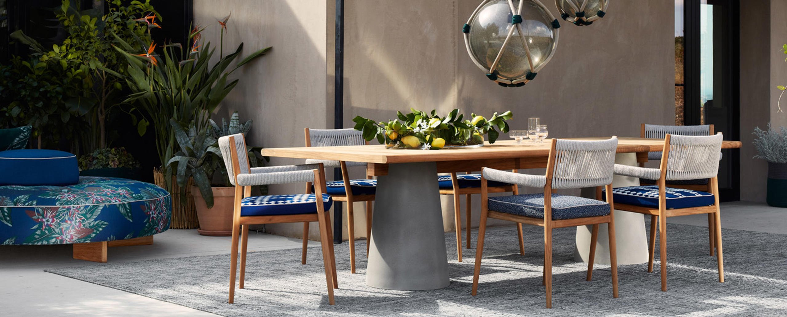 La famiglia di tavoli Dine Out si distingue per lo stile sofisticato. La base del tavolo tondo è costituita da una singola forma conica disponibile in cemento, con il piano in cemento o in doghe di massello di teak che convergono verso il centro, oppure in terrazzo giallo-bianco o verde-bianco con il piano dello stesso materiale o in teak a contrasto. Due elementi conici – in terrazzo giallo-bianco, verde-bianco o cemento – caratterizzano la versione rettangolare del tavolo, che presenta il piano in solo massello di teak, in due misure. Completa la collezione una sedia.