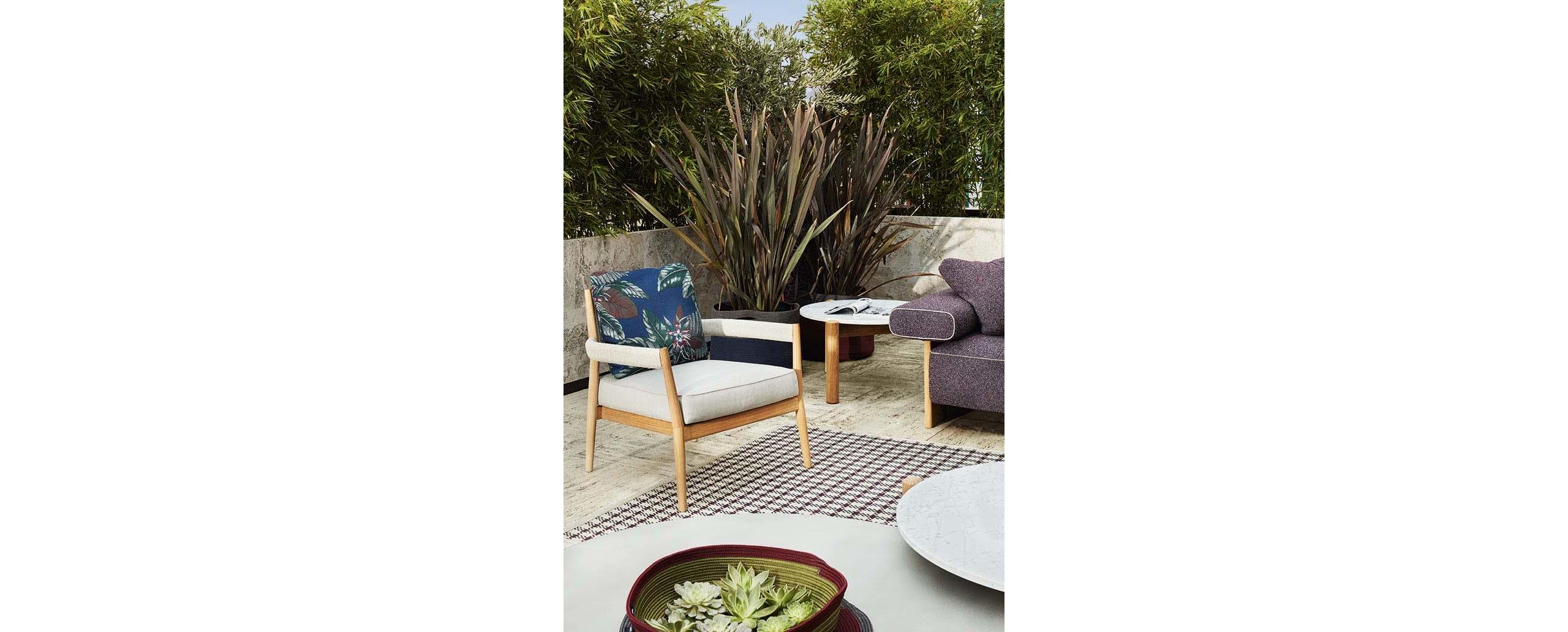 Con dettagli curati e forme accoglienti, la poltroncina impilabile Dine Out ha una struttura in massello di teak impreziosita da una corda in polipropilene grigio intrecciata a mano intorno ai braccioli e alla parte superiore dello schienale. La comodità della seduta è data da un cuscino in ovatta con un inserto in poliuretano espanso, fissato con due fasce sulle doghe in massello di teak lasciando a vista il telaio in legno, e arricchito da un profilo in gros-grain grigio sul bordo superiore. Il cuscino dello schienale è a saponetta con una doppia cucitura e angoli raggiati. Tutte le parti imbottite sono rivestite da tela idrorepellente.