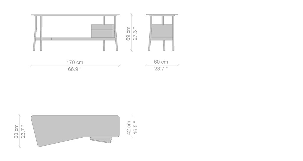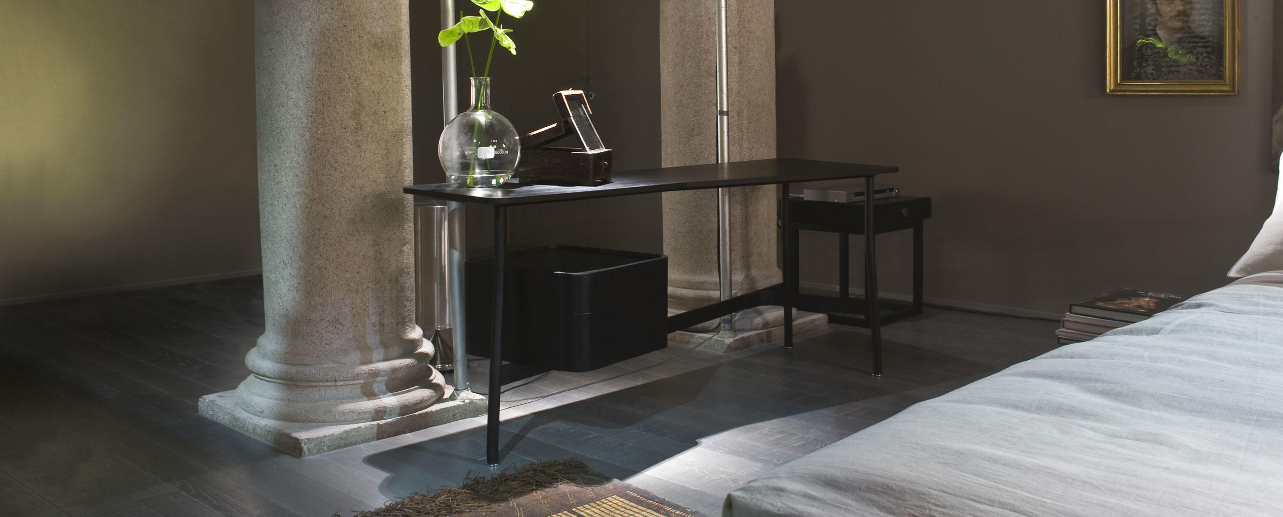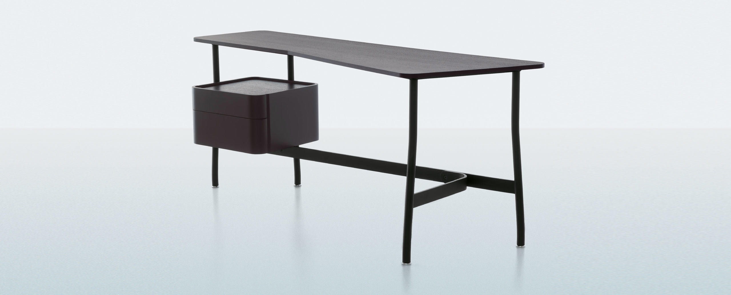 Lo scrittoio Sled, disegnato da Rodolfo Dordoni, ha una personalità versatile, che lo ren-de adatto sia alla camera da letto sia alla zona living della casa, in abbinamento ad altri arredi della collezione Cassina. La struttura è in rovere tinto nero con piano sagomato sinistro o destro e cassettiera a due cassetti, dotati di vassoio interno, laccata nero opaco con top in rovere tinto nero, posizionabile a sinistra o a destra.
