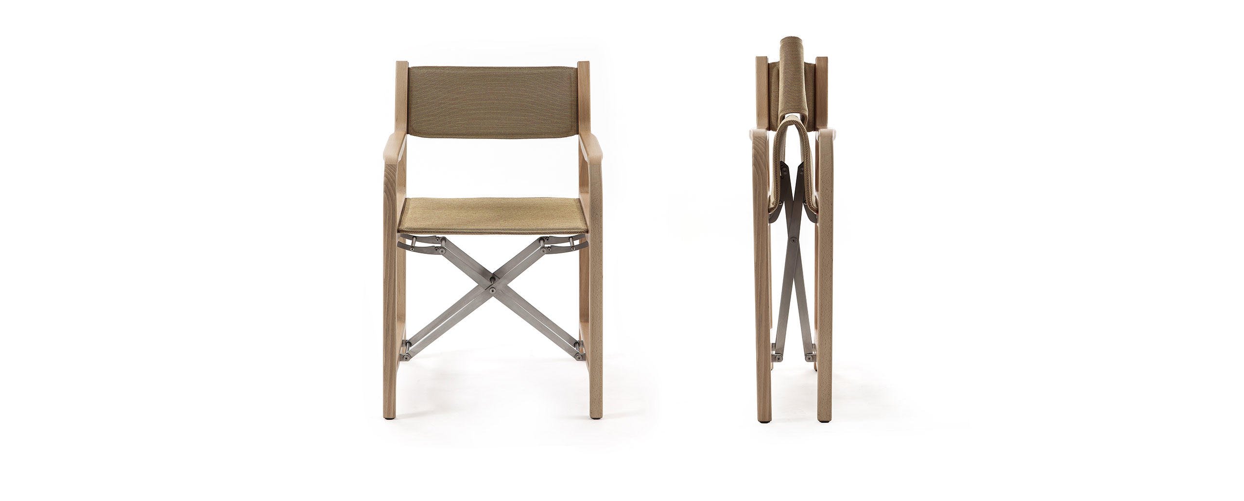 Questa raffinata interpretazione della sedia da regista è stata realizzata da Michele De Lucchi per l’Unicredit Pavillon di Porta Nuova, a Milano. L’autore sceglie di utilizzare il faggio naturale, materiale resistente e durevole, integrandolo con un meccanismo di acciaio INOX. La sua lavorazione è eseguita all’interno della falegnameria di Cassina impiegando macchine di tecnologia avanzata cui subentrano gli artigiani per le fasi di rifinitura e assemblaggio a mano. La qualità dell’oggetto è rimarcata dalla leggerezza ottenuta attraverso la struttura e i braccioli con una sagomatura variabile e sinuosa, mentre lo schienale e la seduta presentano una comoda imbottitura. L’essenza del legno è volutamente naturale e trattata con una vernice low-gloss che esalta il calore della materia. Grazie alla struttura pieghevole l’oggetto dimostra grande praticità in ogni ambiente, risultando particolarmente versatile in spazi domestici dalle dimensioni ridotte.