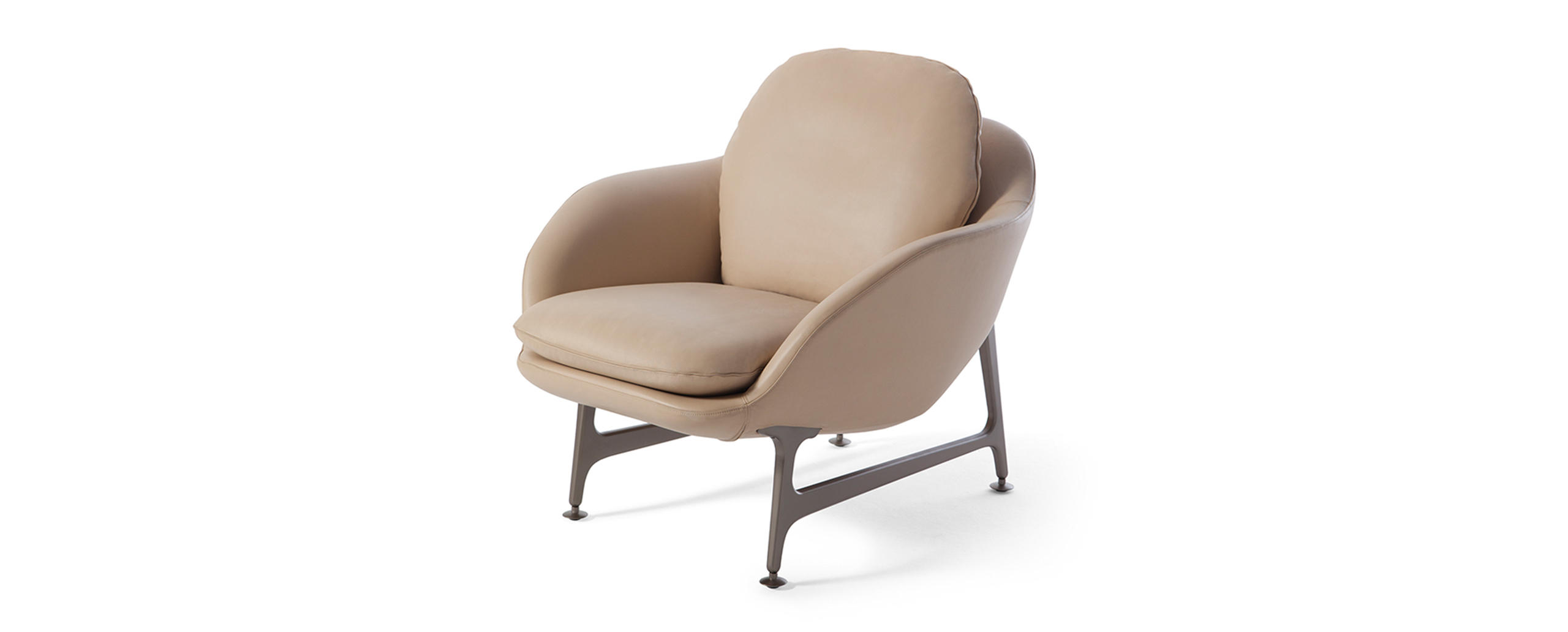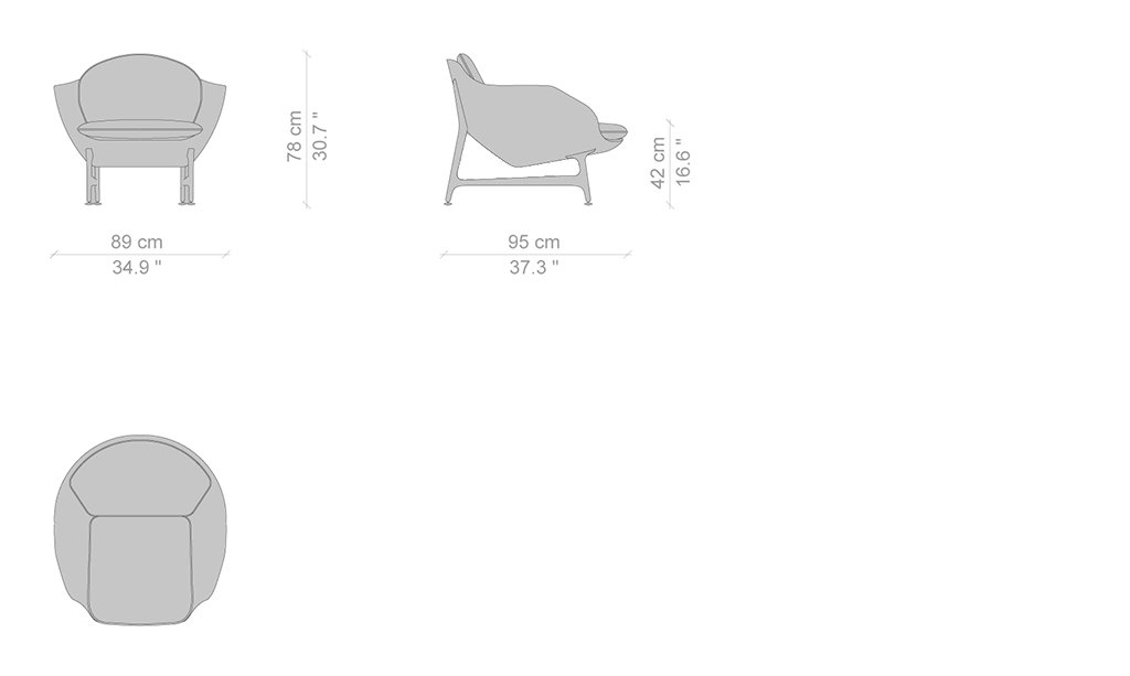 Poltrona, divano a due posti e divano a tre posti. Scocca in poliuretano espanso, privo di CFC, con cinghie elastiche, rivestita in tessuto o pelle amovibile. Basamento in fusione di alluminio lucido, oppure alluminio verniciato nei colori nero opaco o bronzo satinato. Piedini in materiale plastico. Cuscini di seduta in poliuretano espanso e ovatta di poliestere.