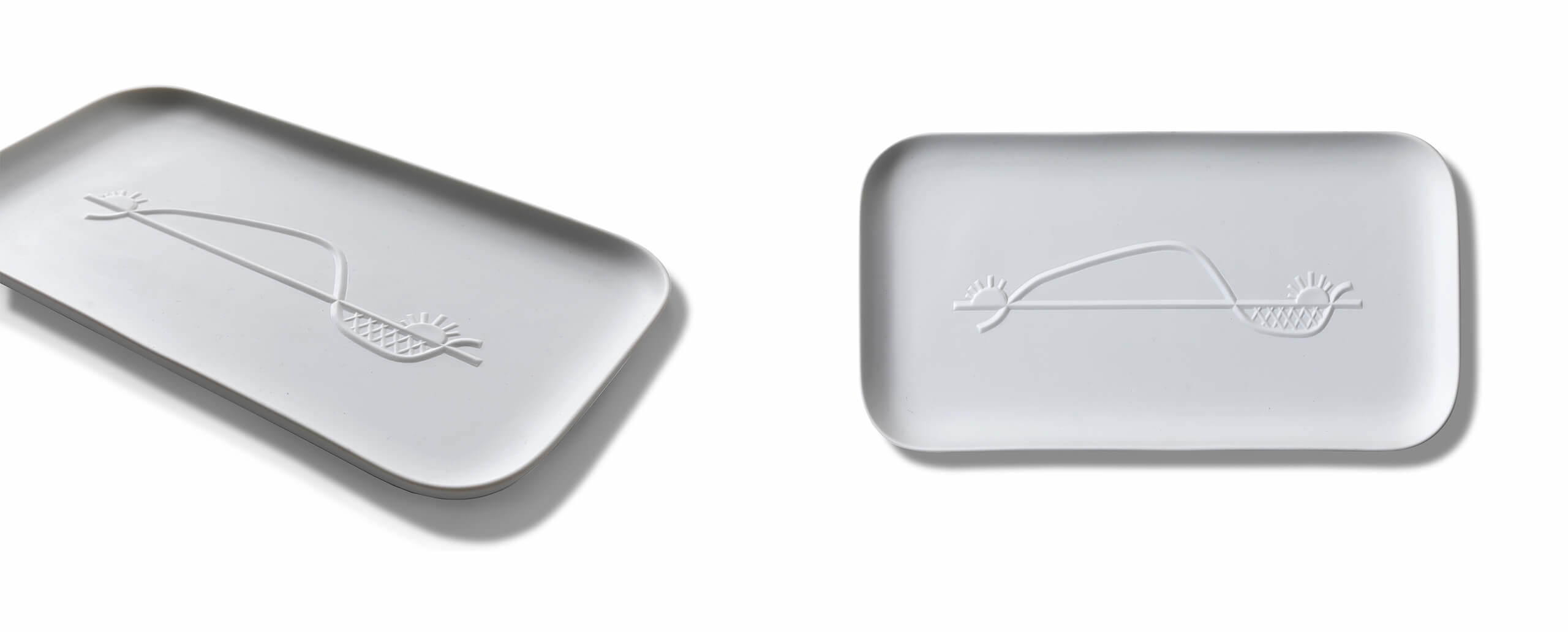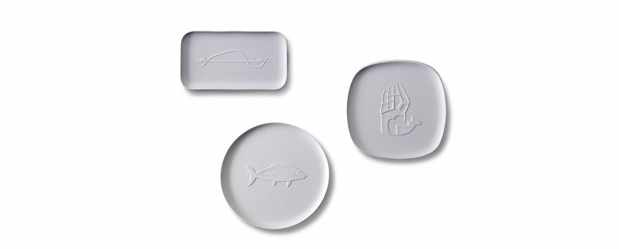 Cassina si ispira al genio di Le Corbusier per una collezione di tre vassoi in porcellana pura non smaltata, che riprendono alcuni simboli in bassorilievo scelti per i muri degli edifici di Chandigarh, la città progettata negli anni ’50, oggi iscritta nella lista del Patrimonio mondiale dell’umanità. Lo stesso procedimento si ritrova a Marsiglia nell’Unité d’Habitation con le sculptures moulées, disegni simbolici fatti imprimere da Le Corbusier nel cemento – béton brut – tratti dal suo repertorio figurativo. Ciascun vassoio, realizzato da Richard Ginori, riporta un soggetto tracciato dal Maestro nel 1956: la mano aperta che rievoca alla pace (vassoio quadrato con gli angoli smussati), il pesce (vassoio tondo), il movimento del sole (vassoio rettangolare).