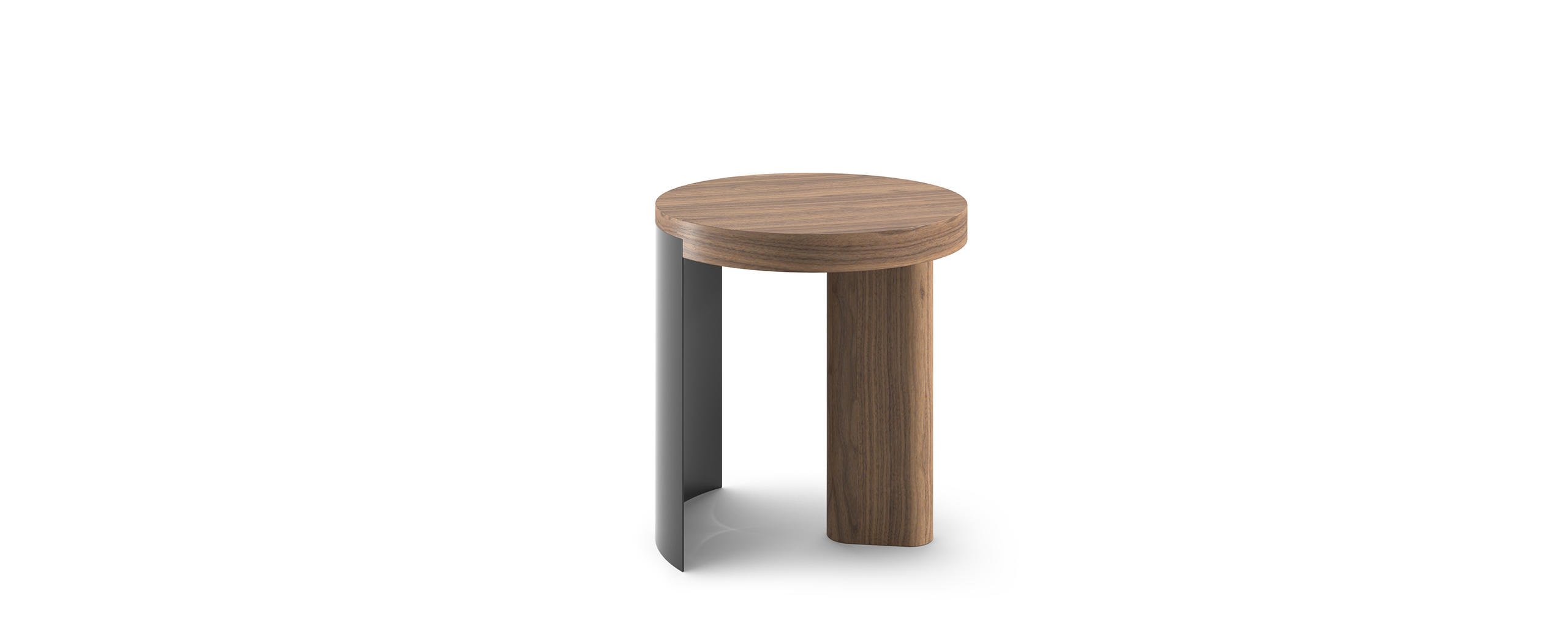 Comodino con piano e gamba disponibili in mdf laccato lucido in vari colori oppure in legno noce Canaletto o rovere (in diverse finiture), con secondo appoggio in lamiera di alluminio curvata e verniciata color nero lucido o amaranto lucido. Da abbinare al letto Bio-mbo.