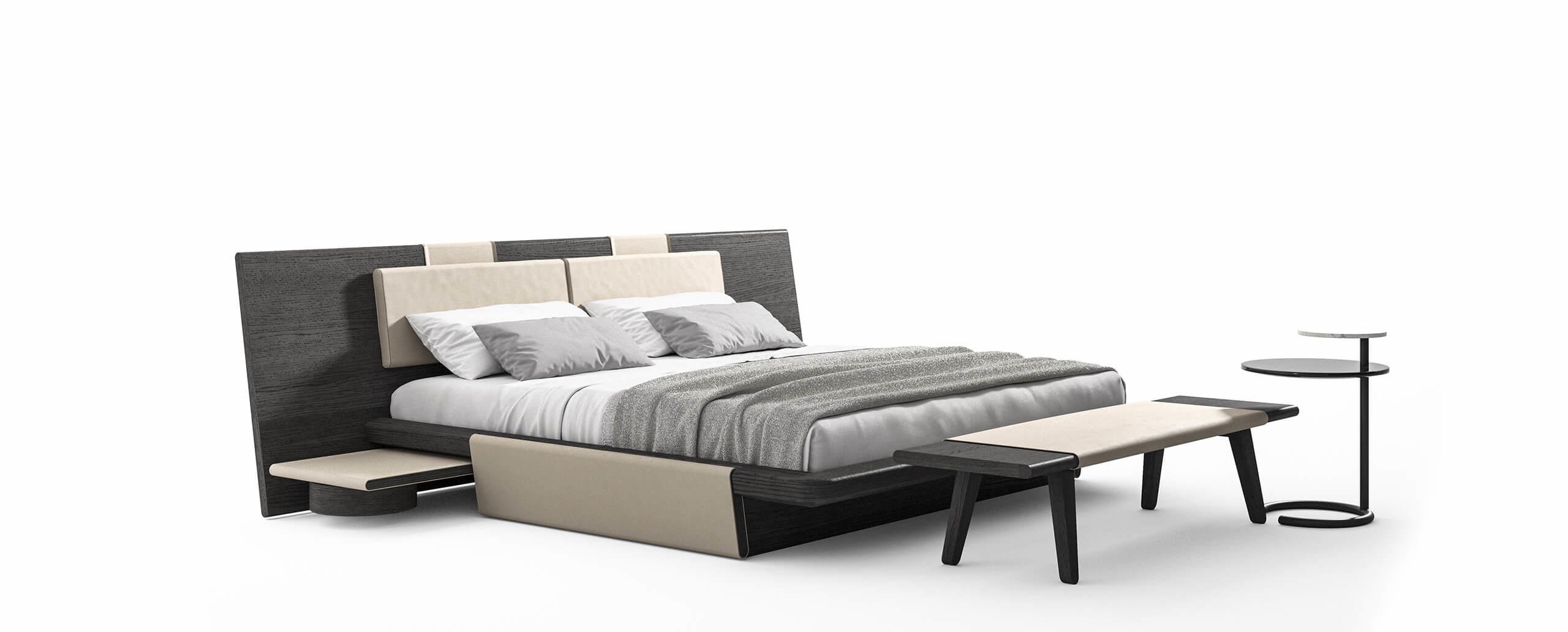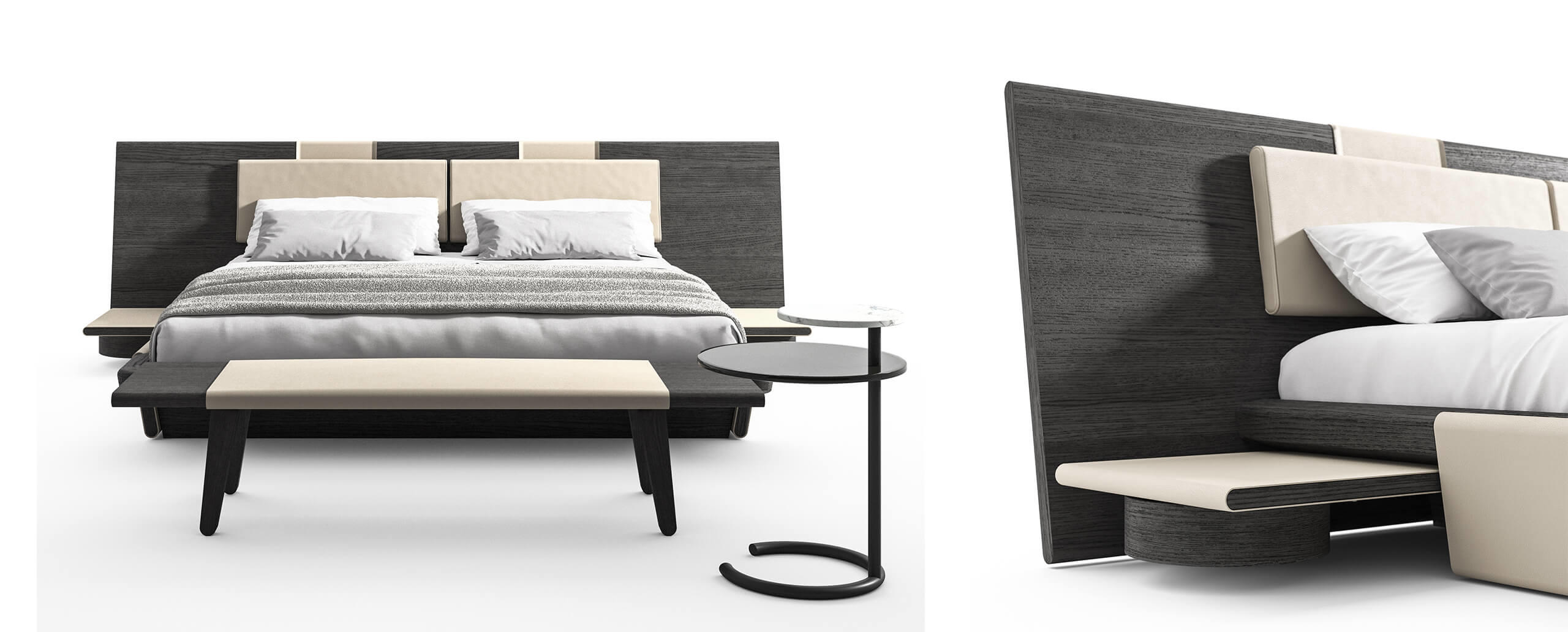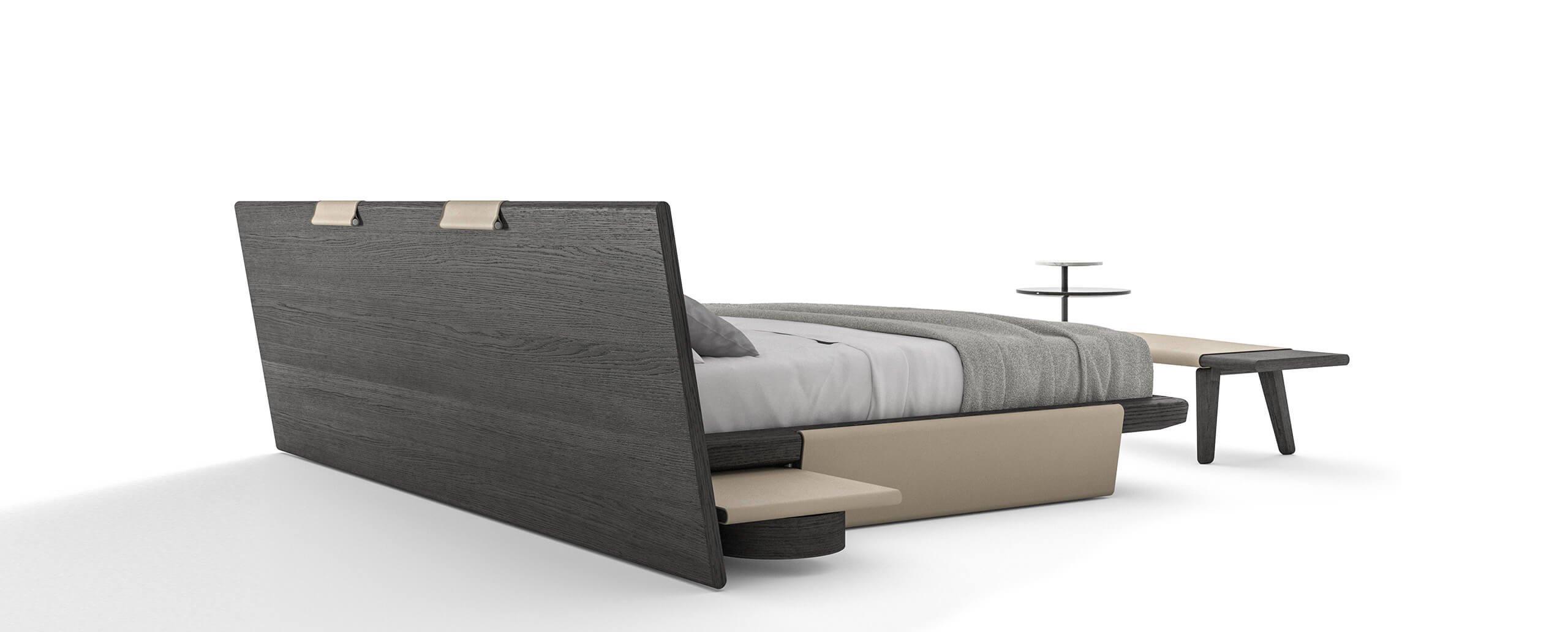 Il modello si distingue per l’accostamento di materiali diversi usati in modo sapiente, a creare un sistema sofisticato e completo capace di arredare l’intera camera da letto. La testiera – in versione a filo giroletto o larga – è in frassino tinto noce chiaro o tinto moka con profili superiori e inferiori in massello, e ha cuscini in pelle o tessuto regolabili in altezza attraverso una fascia in pelle, che creano un comodo appoggio per la schiena. L’opzione in tessuto può essere inoltre dotata di uno strato purificante di theBreath?, una tecnologia brevettata che lavora senza fonti energetiche catturando e disaggregando le particelle inquinanti. Il giroletto, in legno massello, ha dimensioni variabili in base al materasso; può poggiare su due semplici piedi o ospitare due cassettoni con frontale rivestito in pelle.