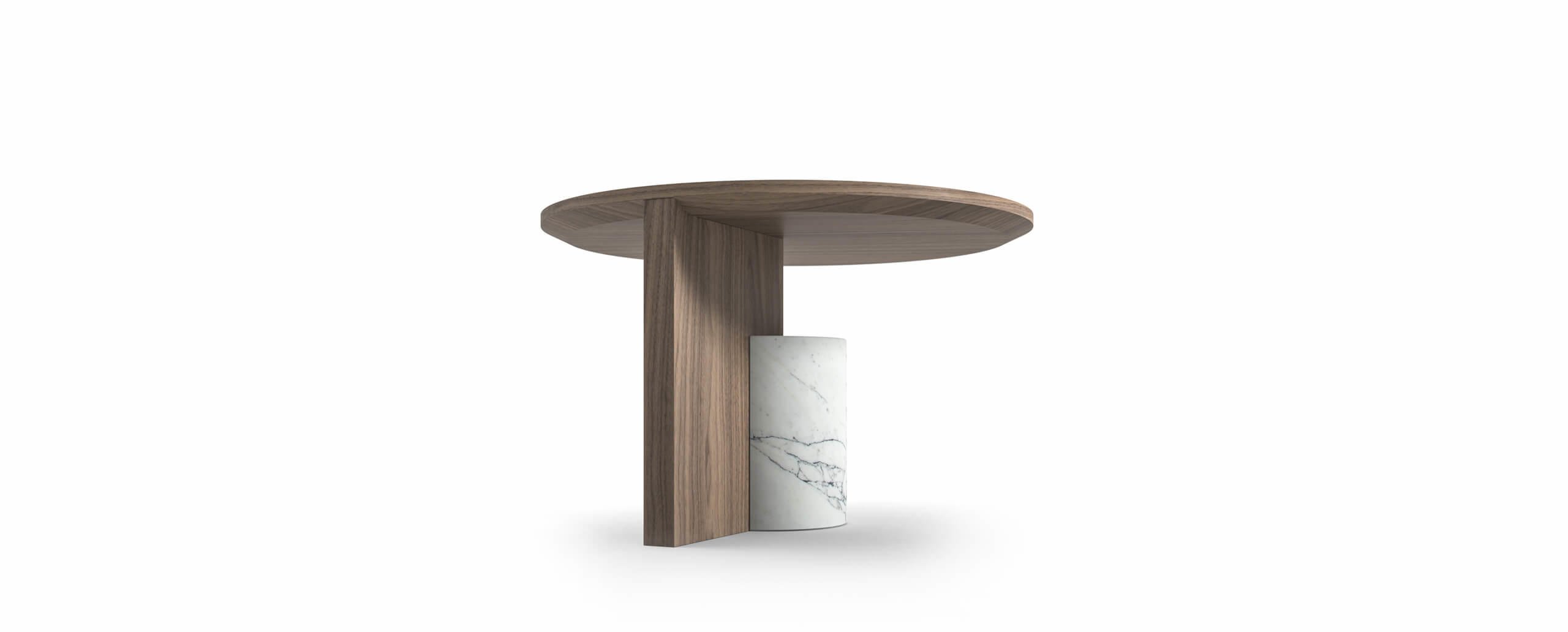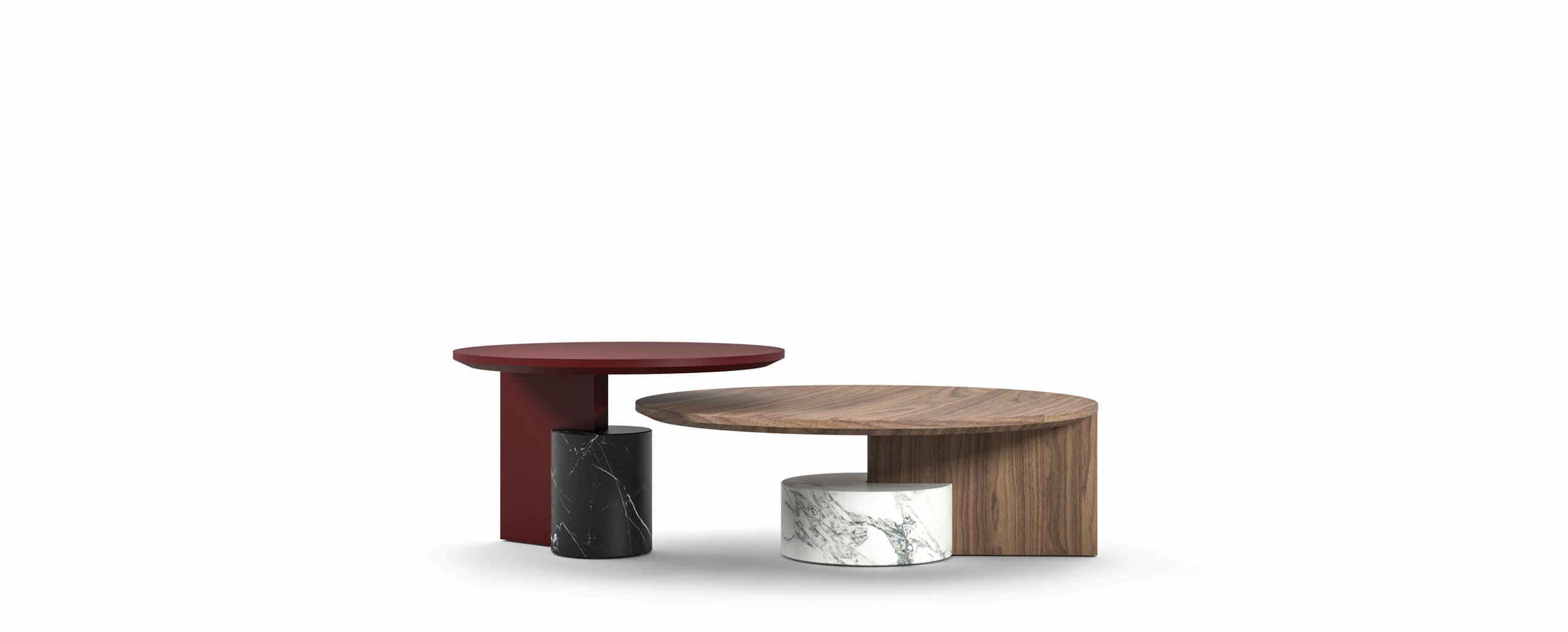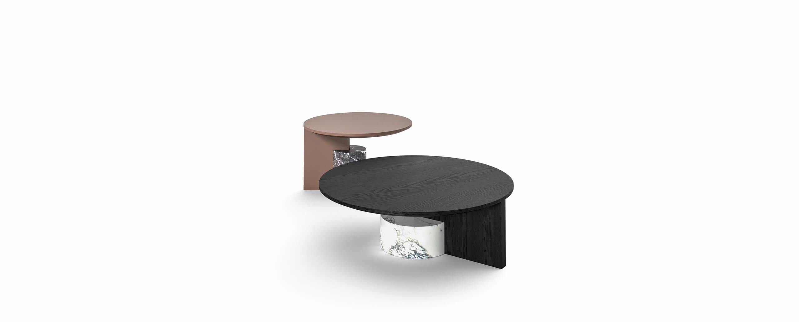 Collezione di tre tavolini, ciascuno con una diversa altezza, composti da un basamento in marmo opaco satinato a mole – disponibile nelle varianti Carrara, Marquinia o Grigio Carnico – da un supporto verticale e da un piano, quest’ultimi realizzati in pannelli di legno impiallacciati in rovere tinto nero o noce canaletto o laccati.