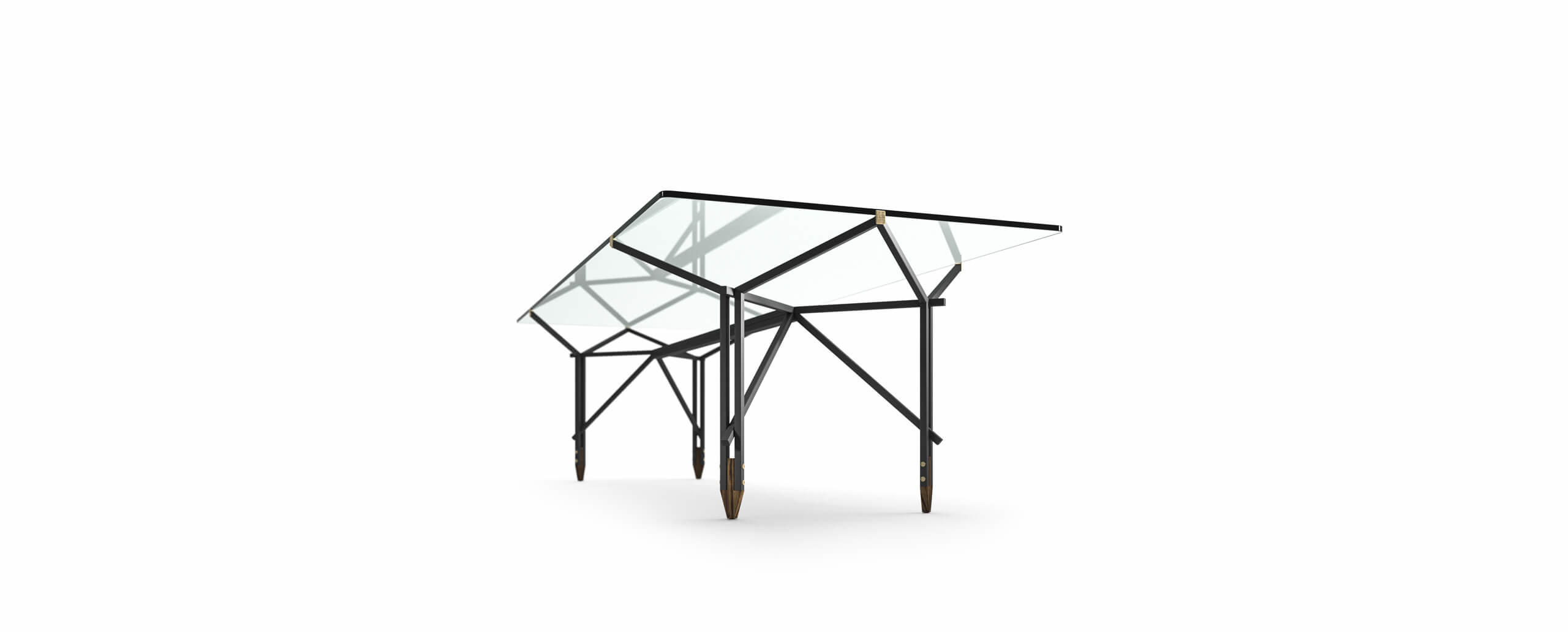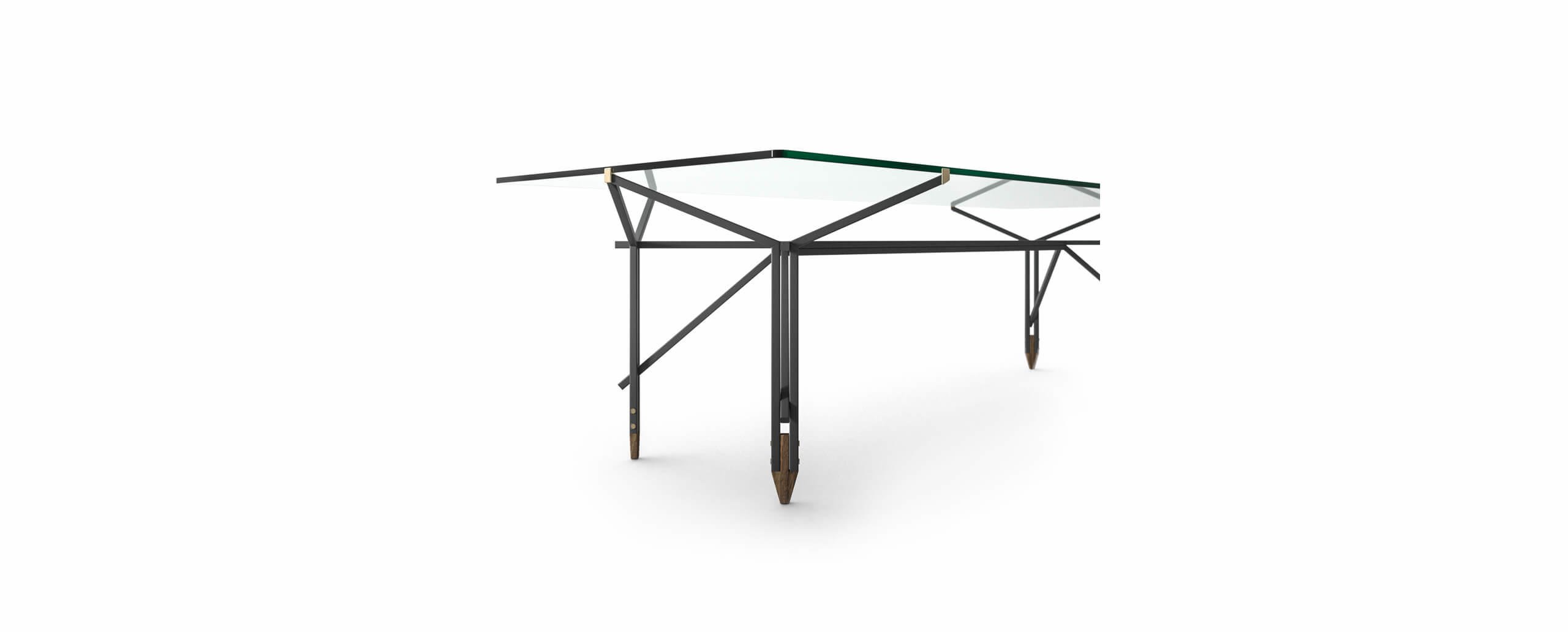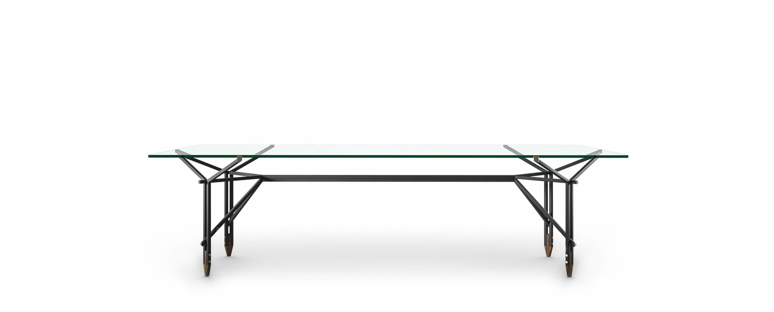 Disegnato nel 1955, il progetto di questo tavolo – arredo considerato da Ico Parisi un elemento centrale all’interno dell’abitazione – accompagna la carriera del Maestro evol-vendosi con materiali differenti e numerose varianti per diverse committenze private. Il tavolo Olimpino ha una struttura snella, audace e riconoscibile in tubolare di metallo a sezione quadrata costituita da due coppie di montanti a “Y”, i cui bracci superiori interni convergono, unendosi sotto le testate del piano, mentre i bracci esterni divergono, bloc-cando, con un fermo laterale in ottone, la lastra rettangolare del piano, in vetro monolitico temperato. Le gambe, così appaiate, sono rese solidali da una doppia traversa, anch’essa in metallo, che si divide in prossimità dei lati a formare una duplice “V”. I pie-dini a freccia, in legno massello, impreziosiscono il disegno, così come le grosse viti in ottone. Disponibile in due misure e in un’unica altezza.
