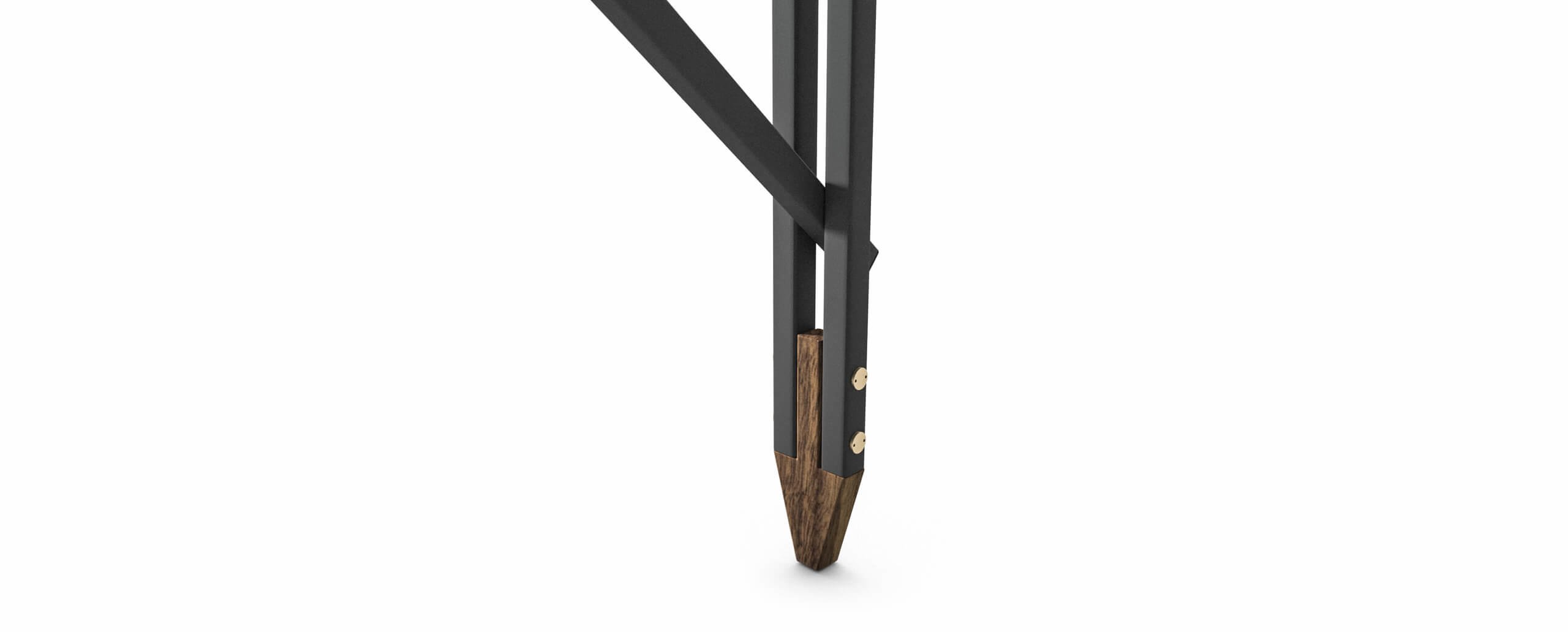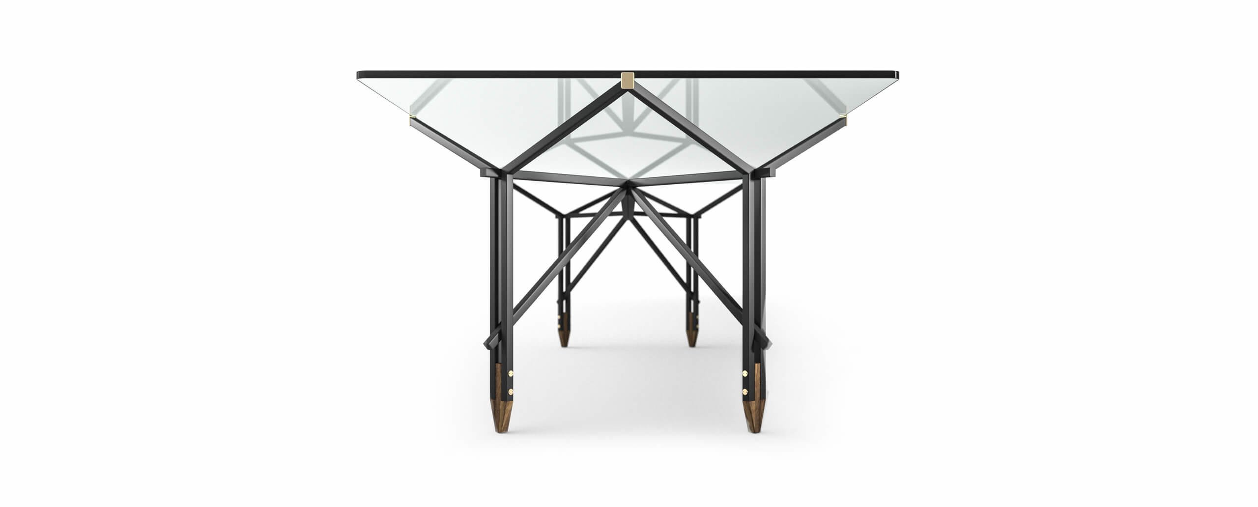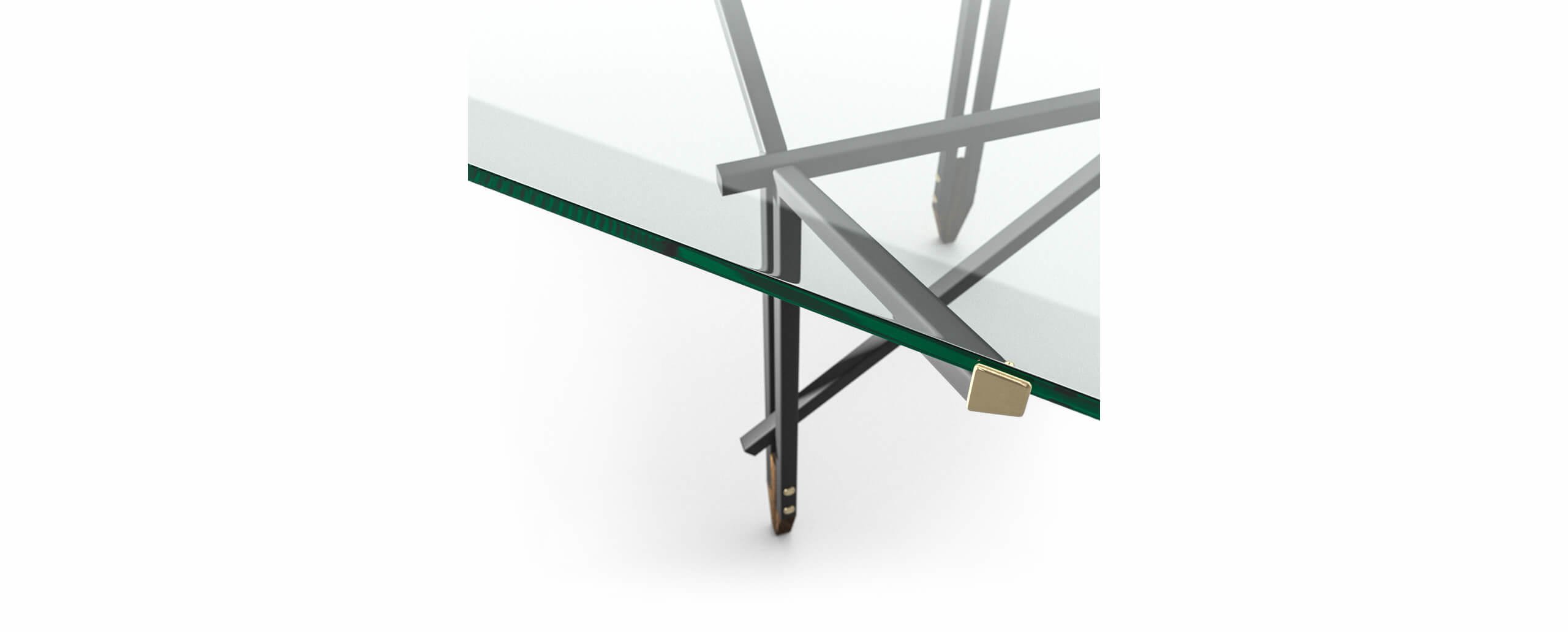 Disegnato nel 1955, il progetto di questo tavolo – arredo considerato da Ico Parisi un elemento centrale all’interno dell’abitazione – accompagna la carriera del Maestro evol-vendosi con materiali differenti e numerose varianti per diverse committenze private. Il tavolo Olimpino ha una struttura snella, audace e riconoscibile in tubolare di metallo a sezione quadrata costituita da due coppie di montanti a “Y”, i cui bracci superiori interni convergono, unendosi sotto le testate del piano, mentre i bracci esterni divergono, bloc-cando, con un fermo laterale in ottone, la lastra rettangolare del piano, in vetro monolitico temperato. Le gambe, così appaiate, sono rese solidali da una doppia traversa, anch’essa in metallo, che si divide in prossimità dei lati a formare una duplice “V”. I pie-dini a freccia, in legno massello, impreziosiscono il disegno, così come le grosse viti in ottone. Disponibile in due misure e in un’unica altezza.