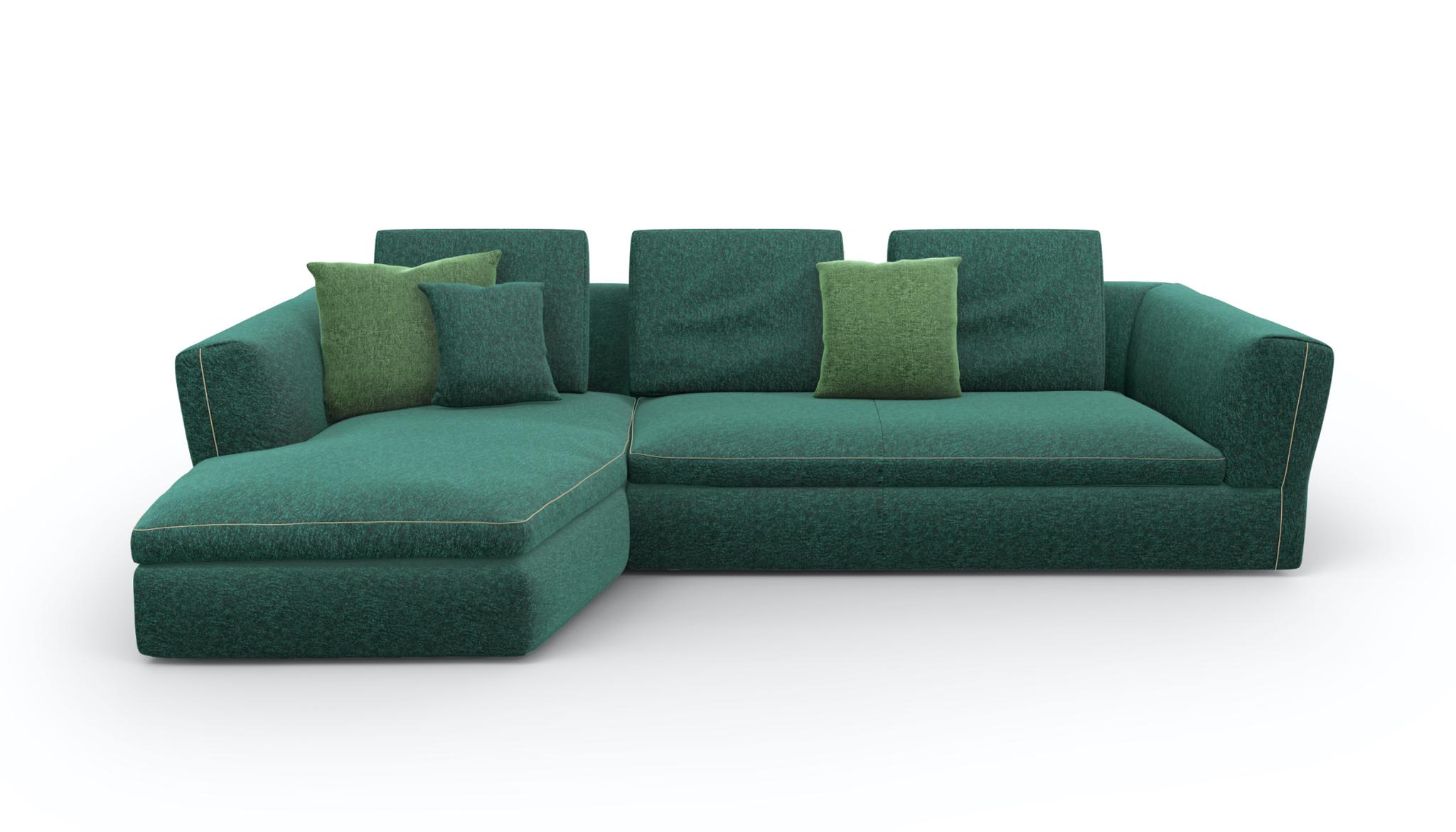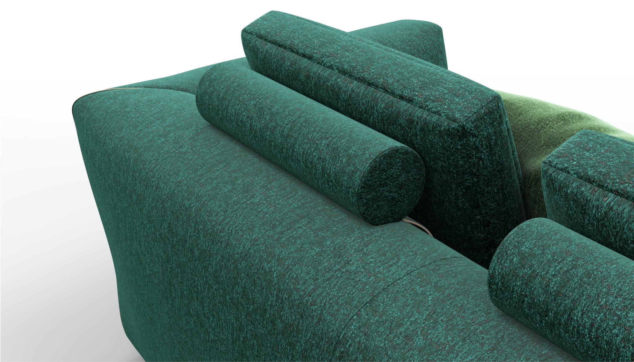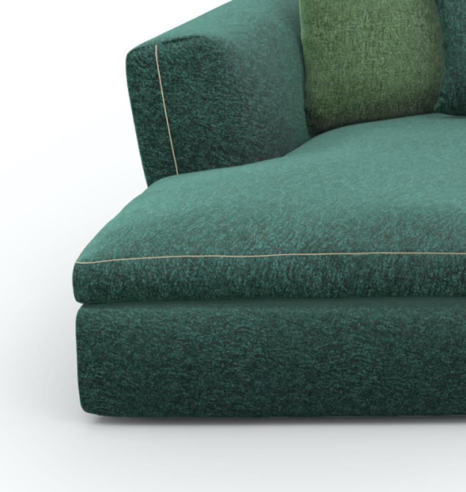 A sofa backrest cushion for a sectional sofa envisioned as a custom garment, with sophisticated details reminiscent of bespoke tailoring and a wide selection of elements to combine in arrangements or use individually.
