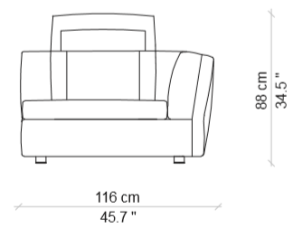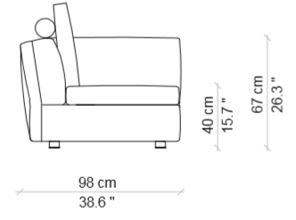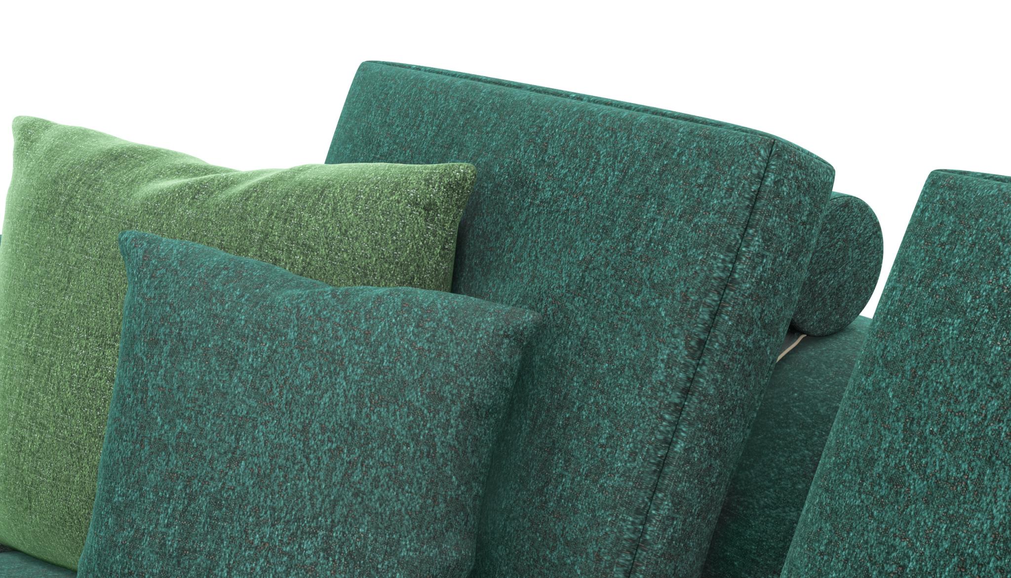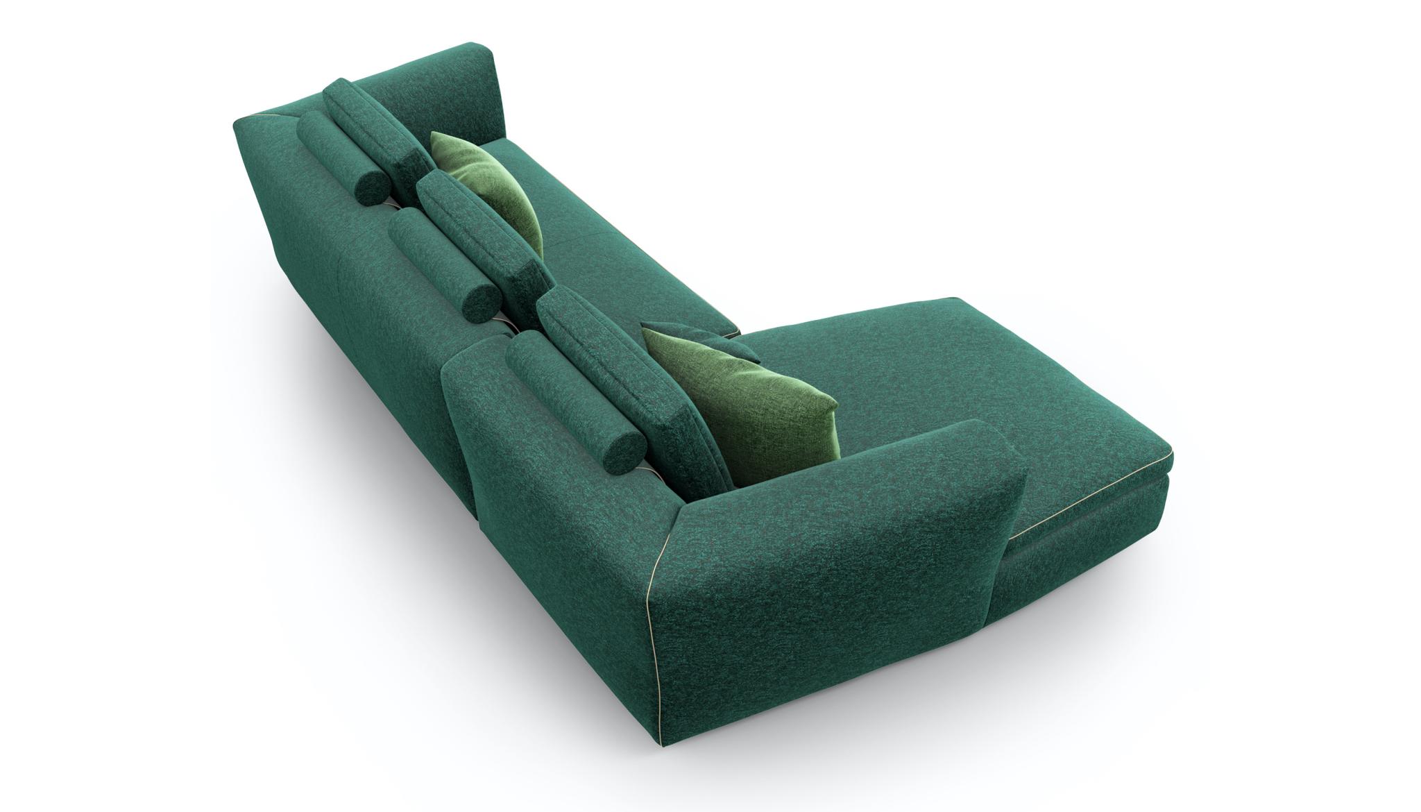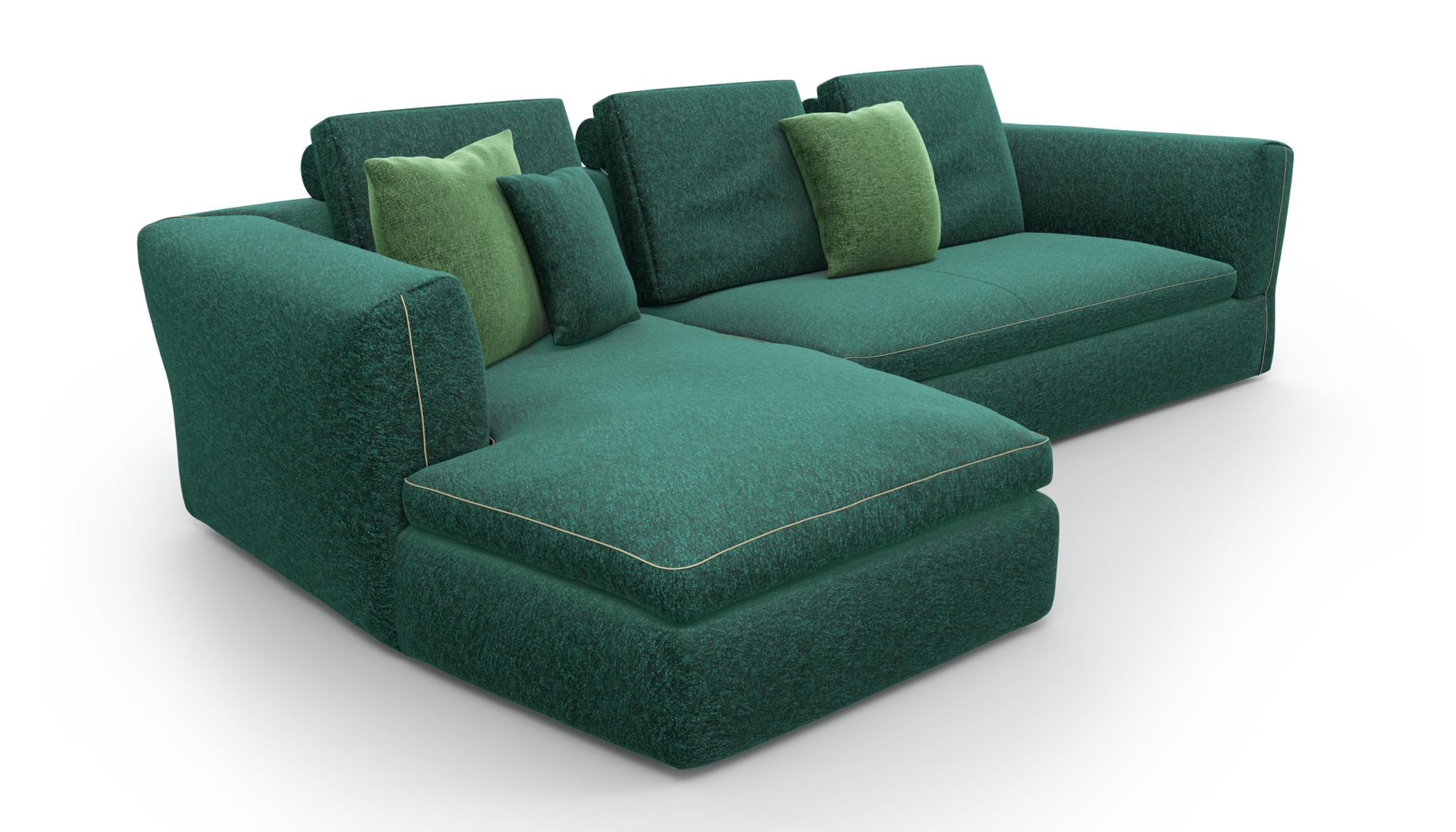 A sofa backrest cushion for a sectional sofa envisioned as a custom garment, with sophisticated details reminiscent of bespoke tailoring and a wide selection of elements to combine in arrangements or use individually.