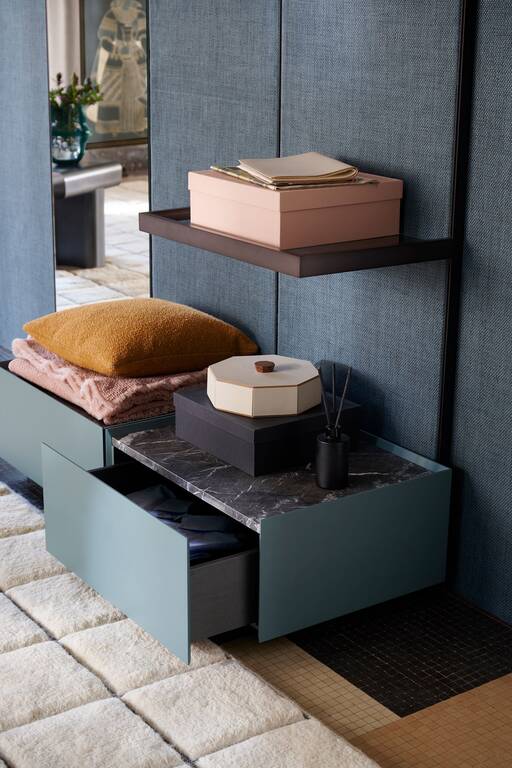 創新特點在于減少了約30mm的面板和支架厚度,從而可以偽裝結構并使墻壁像畫布一樣震撼。框架和支撐采用電氣化擠壓成型鋁齒軌,面板有不同的處理,如木質漆面或鑲貼木、鏡面玻璃或背漆玻璃、布藝,以及為臨時裝飾或墻紙準備的版本。此外,還配有一系列的附件,如帶有珍貴玻璃的不同深度的面板,可以使用LED燈照明,擱板上有一個配備了微纖密封圈的掛衣軌道,可以牢固而安靜地放置衣架,并且還有一面鏡子。