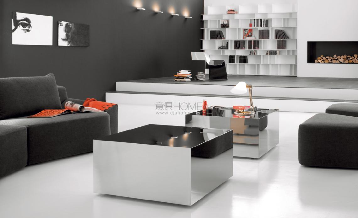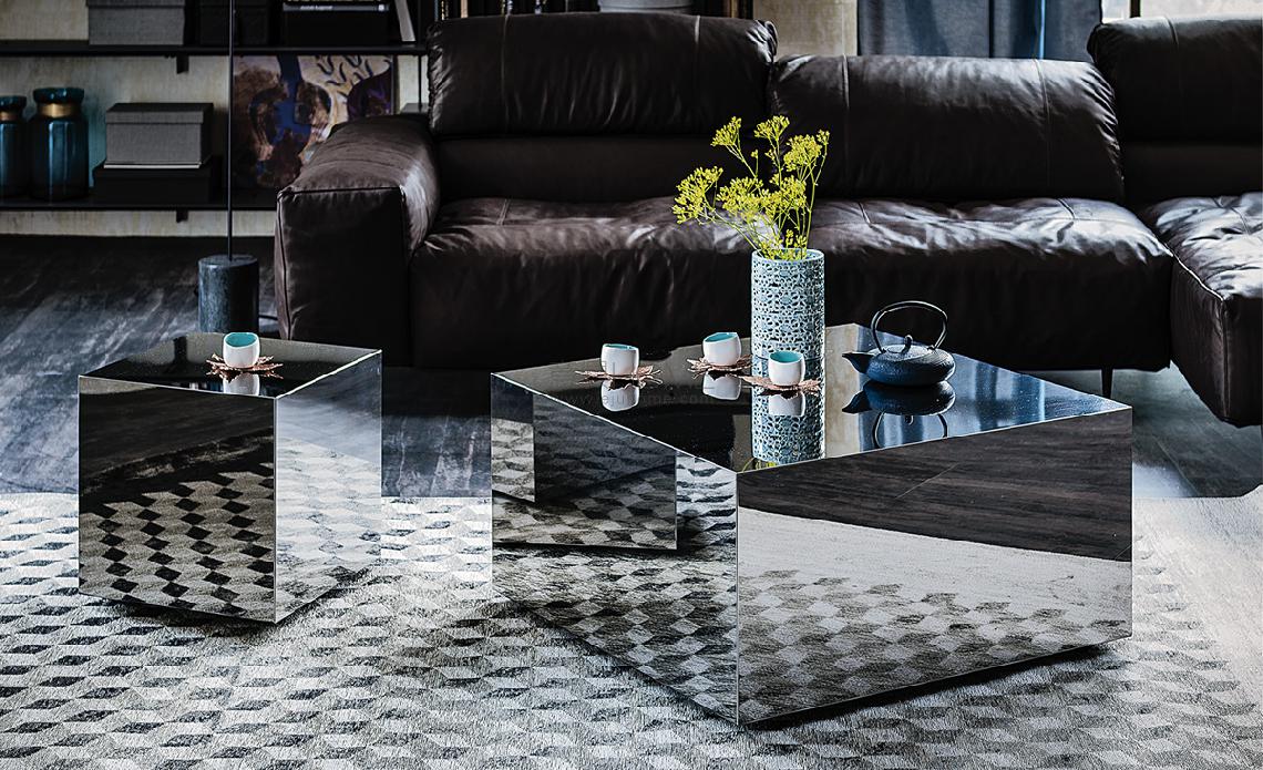 Cube or parallelepiped with wheels in polished stainless steel. Small reflection irregularities are due to manual processing.