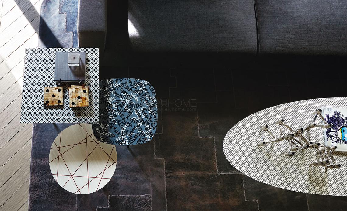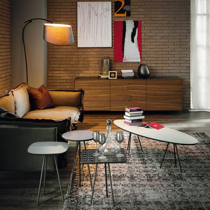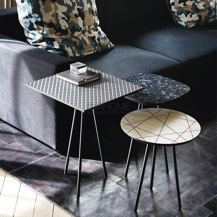 Coffee table with graphite (GFM69) or white (GFM71) embossed steel base. Top in printed maple with geometric pattern.
