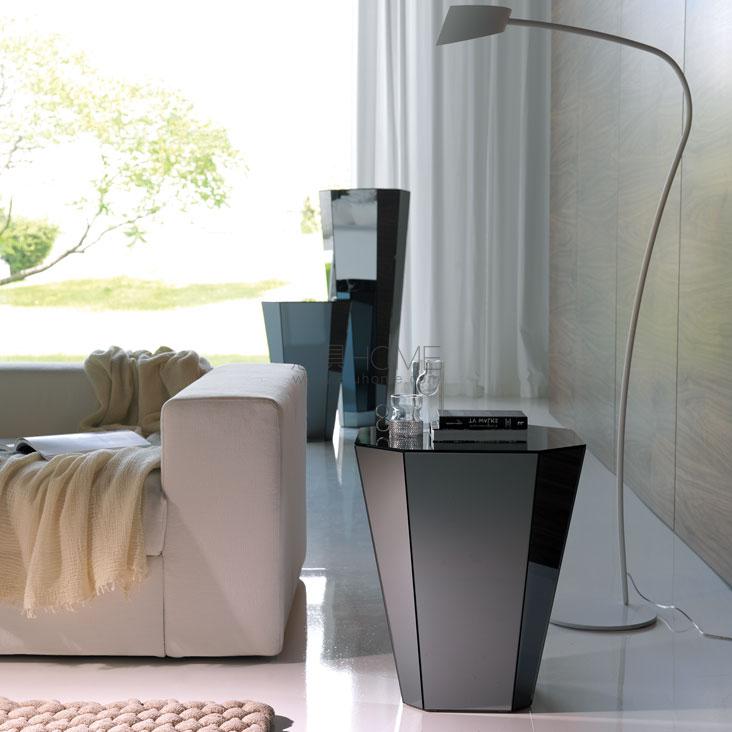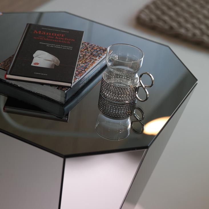 Coffee table completely covered in mirrored glass or smoke-grey mirrored glass.