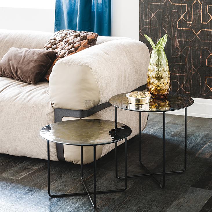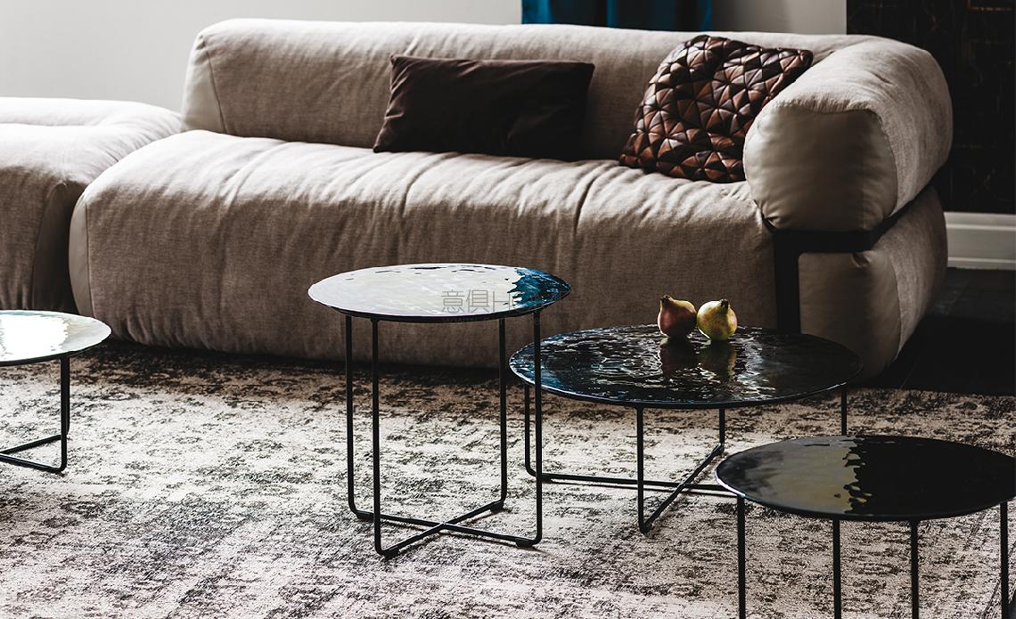 Coffee table with base in chromed steel (08), embossed titanium (GFM11) or black (GFM73) lacquered steel. Murano artistic glass top in Petrolio or Madreperla colors. Handmade top according to the ancient techniques of Murano made of Murano vitreous paste with Madreperla effect. Imperfections, streaks, color variations and irregularities of shape are characteristic of the handmade work and are not to be considered as defects.