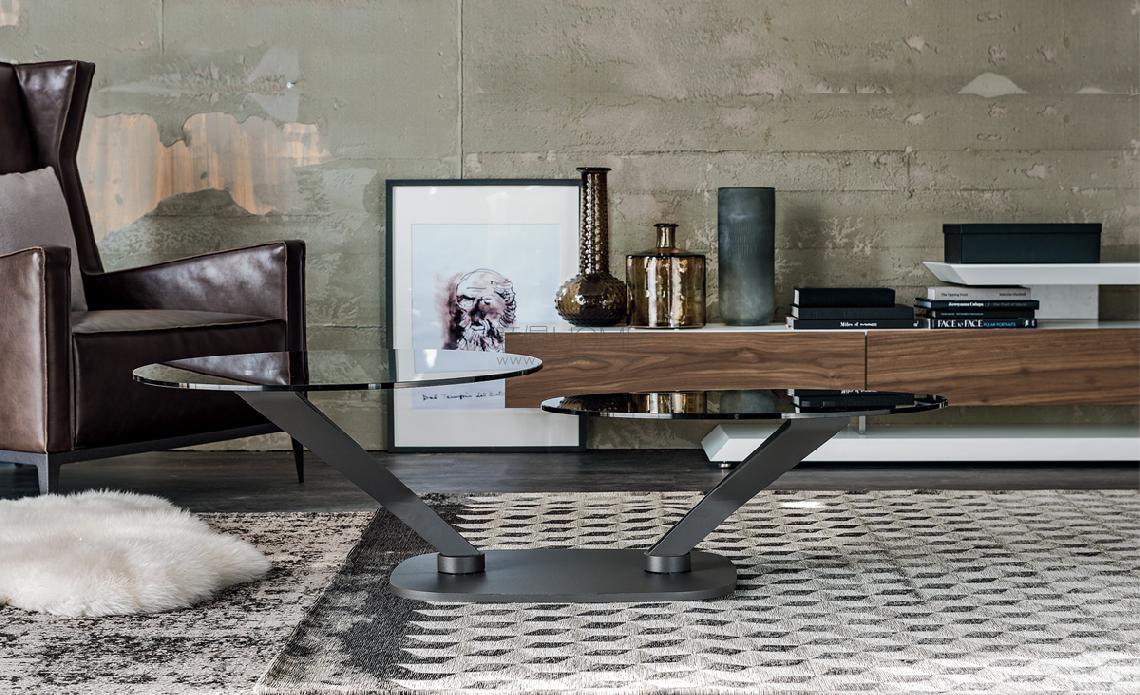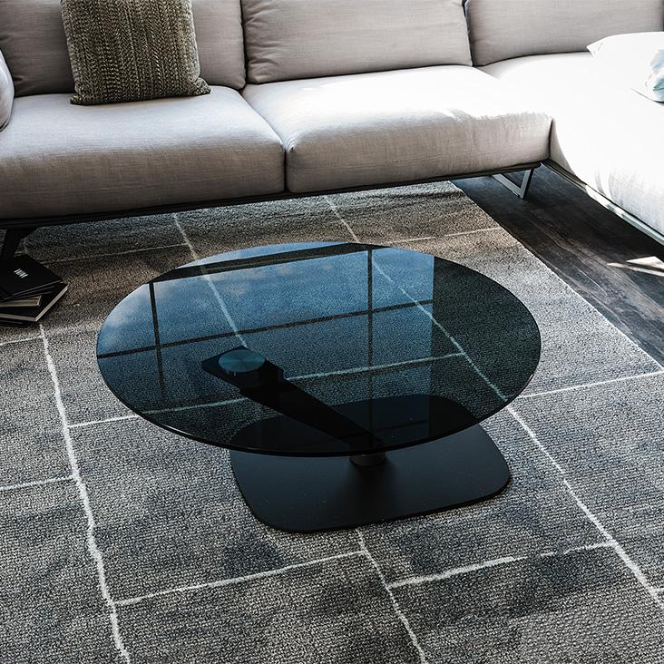 Coffee table with base in graphite (GFM69) embossed lacquered steel. One or two swiveling clear or fumé glass tops.